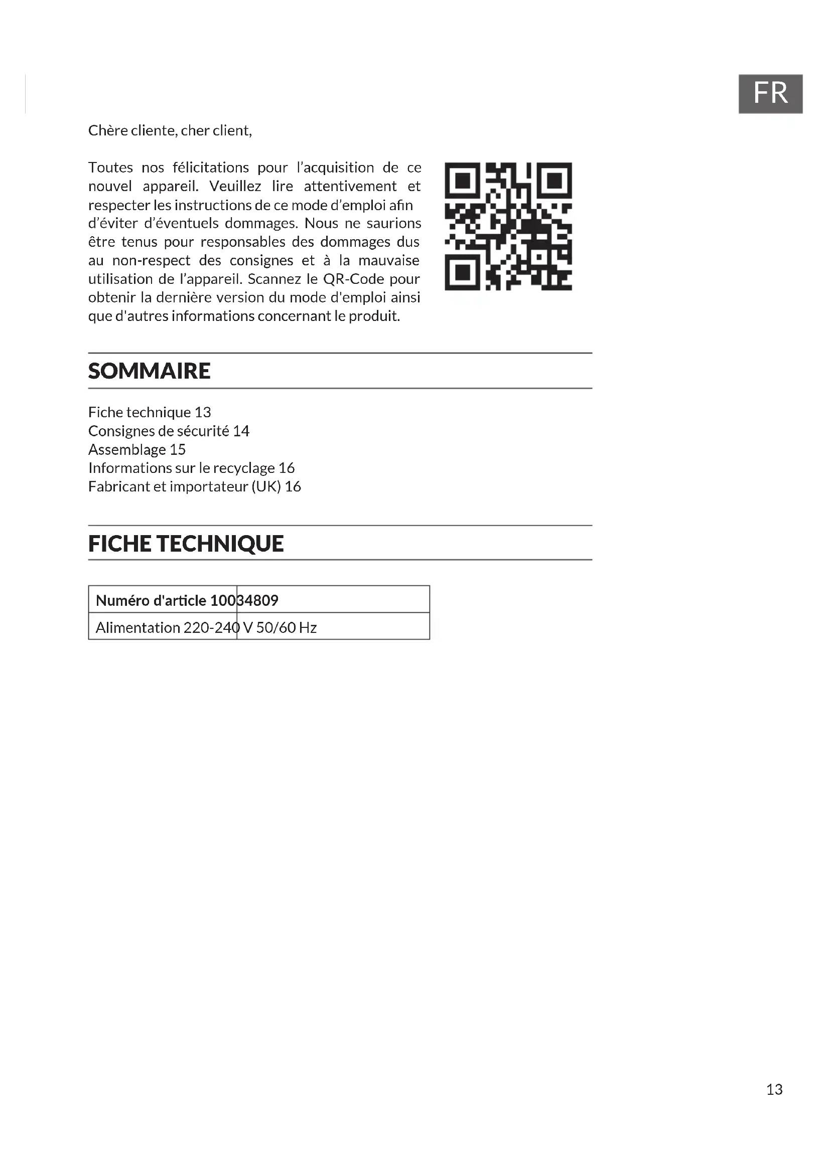 Chère cliente, cher client, Toutes nos félicitations pour l’acquisition de ce nouvel appareil. Veuillez lire attentivement et respecter les instructions de ce mode d’emploi an d’éviter d’éventuels dommages. Nous ne saurions être tenus pour responsables des dommages dus au non-respect des consignes et à la mauvaise utilisation de l’appareil. Scannez le QR-Code pour obtenir la dernière version du mode d'emploi ainsi que d'autres informations concernant le produit. SOMMAIRE Fiche technique 13 Consignes de sécurité 14 Assemblage 15 Informations sur le recyclage 16 Fabricant et importateur (UK) 16 FICHE TECHNIQUE Numéro d'arcle 10034809 Alimentation 220-240 V 50/60 Hz14