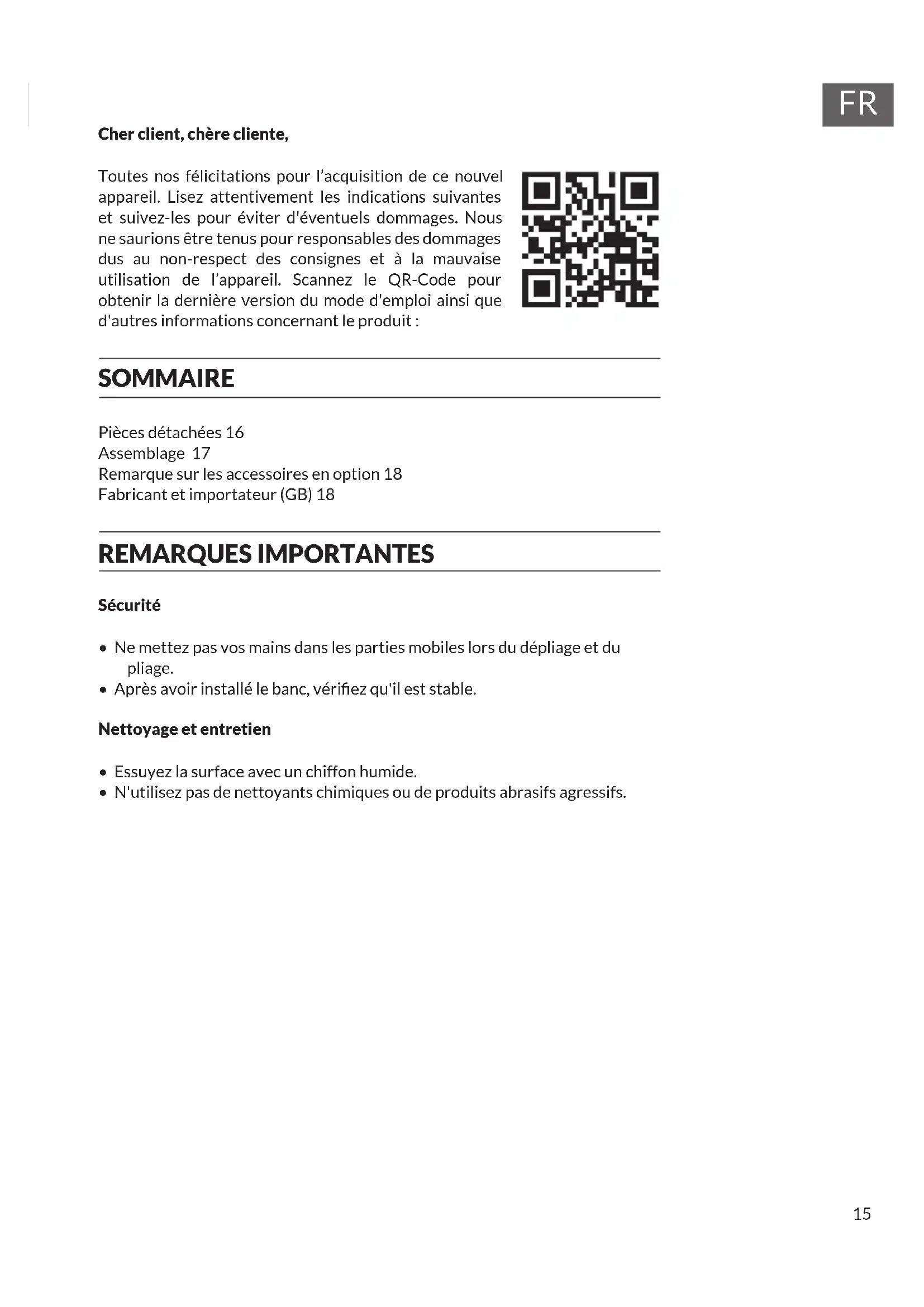 Cher client, chère cliente, Toutes nos félicitations pour l’acquisition de ce nouvel appareil. Lisez attentivement les indications suivantes et suivez-les pour éviter d'éventuels dommages. Nous ne saurions être tenus pour responsables des dommages dus au non-respect des consignes et à la mauvaise utilisation de l’appareil. Scannez le QR-Code pour obtenir la dernière version du mode d'emploi ainsi que d'autres informations concernant le produit : SOMMAIRE Pièces détachées 16 Assemblage 17 Remarque sur les accessoires en option 18 Fabricant et importateur (GB) 18 REMARQUES IMPORTANTES Sécurité