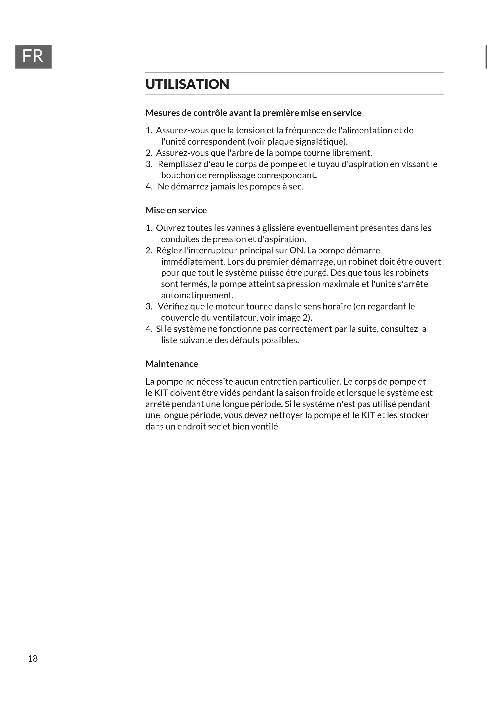 liste suivante des défauts possibles. Maintenance La pompe ne nécessite aucun entretien particulier. Le corps de pompe et le KIT doivent être vidés pendant la saison froide et lorsque le système est arrêté pendant une longue période. Si le système n'est pas utilisé pendant une longue période, vous devez nettoyer la pompe et le KIT et les stocker dans un endroit sec et bien ventilé.19