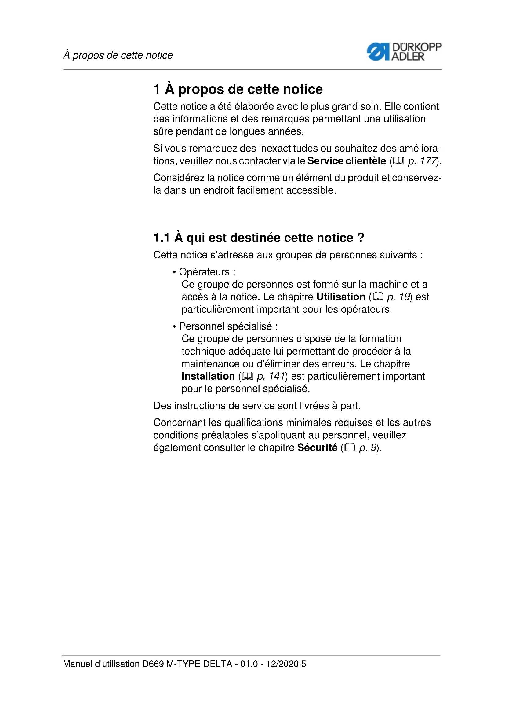 D669 M-TYPE DELTA Manuel d’utilisationTous droits réservés. Propriété de Dürkopp Adler GmbH et protection par les droits d’auteur. Toute réutilisation, même partielle, de ces contenus est interdite sans l’autorisation écrite préalable de Dürkopp Adler GmbH. Copyright © Dürkopp Adler GmbH 2020 IMPORTANT
