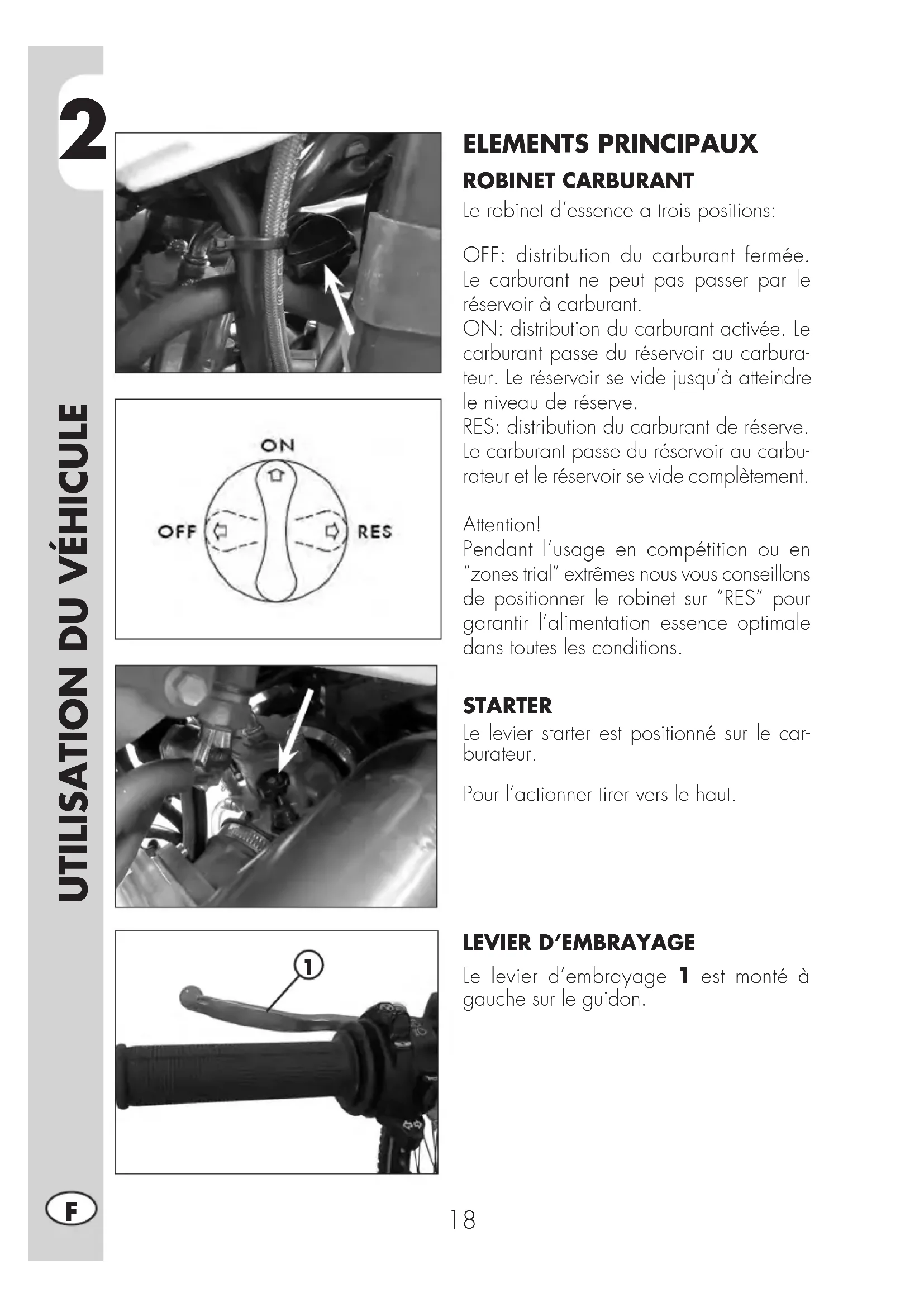 ELEMENTS PRINCIPAUX ROBINET CARBURANT Le robinet d’essence a trois positions: OFF: distribution du carburant fermée. Le carburant ne peut pas passer par le réservoir à carburant. ON: distribution du carburant activée. Le carburant passe du réservoir au carbura- teur. Le réservoir se vide jusqu’à atteindre le niveau de réserve. RES: distribution du carburant de réserve. Le carburant passe du réservoir au carbu- rateur et le réservoir se vide complètement. Attention! Pendant l’usage en compétition ou en “zones trial” extrêmes nous vous conseillons de positionner le robinet sur “RES” pour garantir l’alimentation essence optimale dans toutes les conditions. STARTER Le levier starter est positionné sur le car- burateur. Pour l’actionner tirer vers le haut.