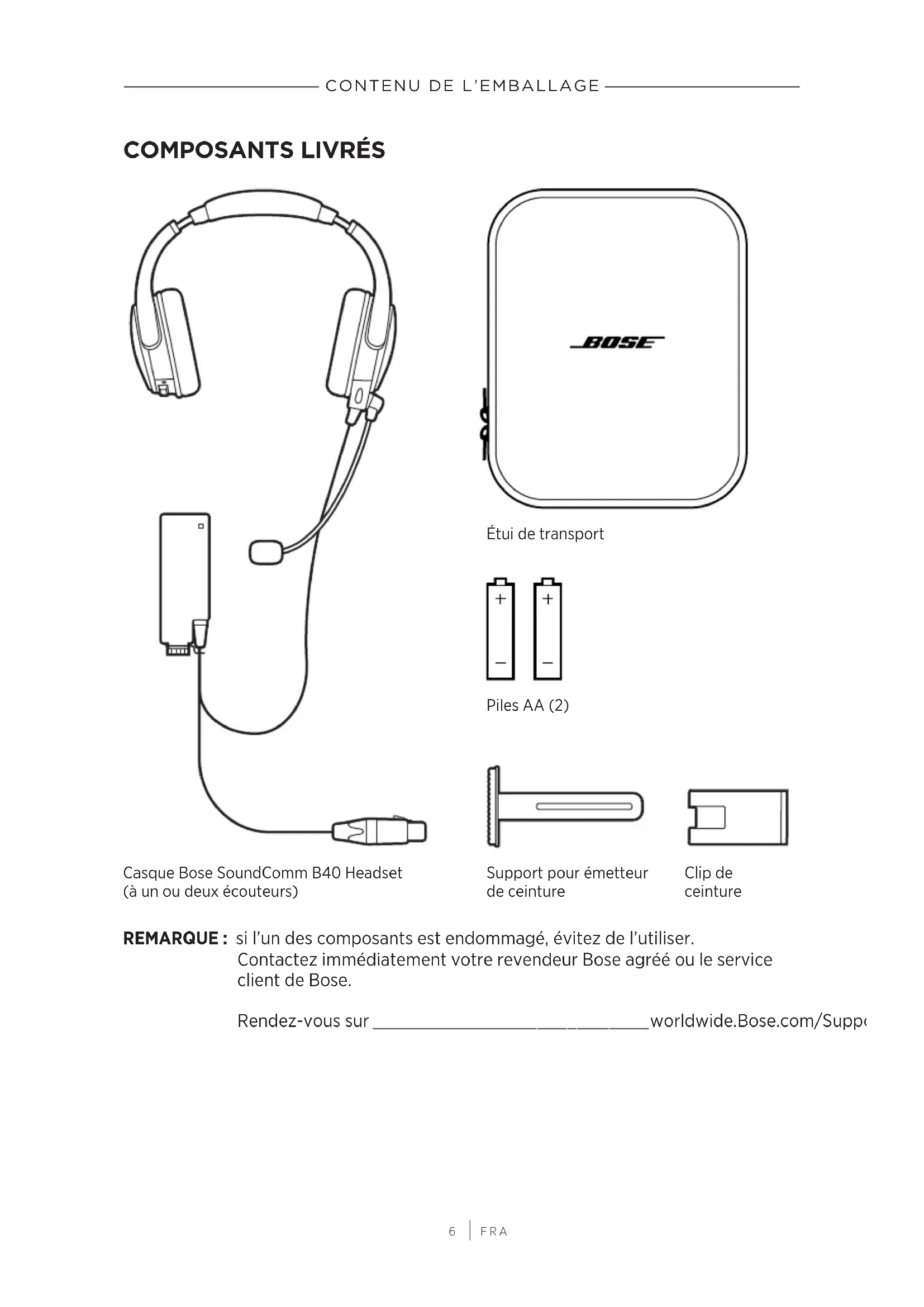 Étui de transport Piles AA (2) Casque Bose SoundComm B40 Headset (à un ou deux écouteurs) Support pour émetteur de ceinture Clip de ceinture REMARQUE: si l’un des composants est endommagé, évitez de l’utiliser. Contactezimmédiatement votre revendeur Bose agréé ou le service client de Bose. Rendez-vous sur worldwide.Bose.com/Support/B40worldwide.Bose.com/Support/B407
