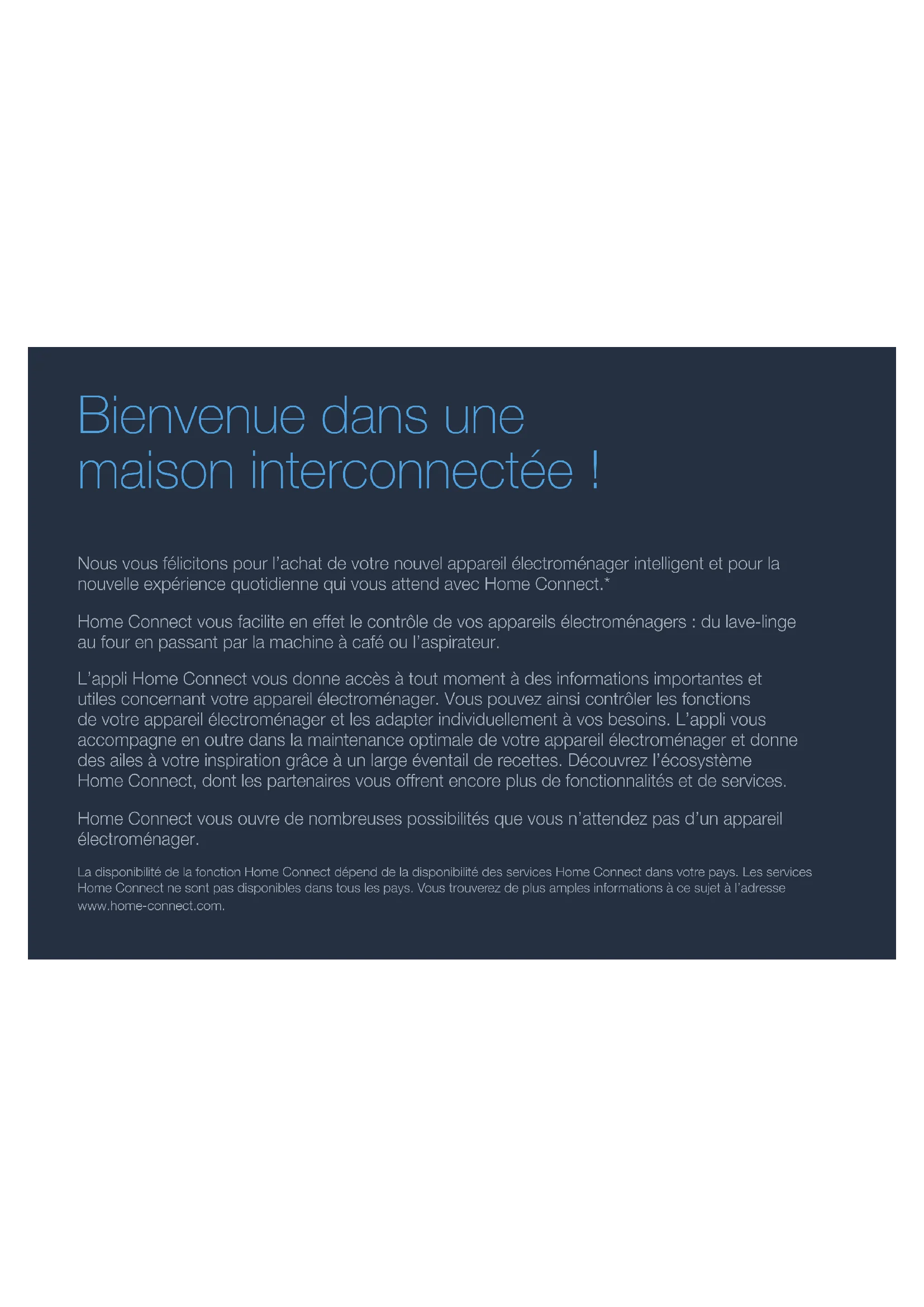 2 | Seguir las instrucciones de la aplicación. En el panel de mando de los indicadores ya no parpadea . Ha nalizado el proceso de conexión. Nota: Si no pudo establecerse la conexión, asegúrese de que el teléfono inteligente/tableta se encuentra en el margen de alcance de su red doméstica.20 DE Nous vous félicitons pour l’achat de votre nouvel appareil électroménager intelligent et pour la nouvelle expérience quotidienne qui vous attend avec HomeConnect.* HomeConnect vous facilite en effet le contrôle de vos appareils électroménagers: du lave-linge au four en passant par la machine à café ou l’aspirateur. L’appli HomeConnect vous donne accès à tout moment à des informations importantes et utiles concernant votre appareil électroménager. Vous pouvez ainsi contrôler les fonctions de votre appareil électroménager et les adapter individuellement à vos besoins. L’appli vous accompagne en outre dans la maintenance optimale de votre appareil électroménager et donne des ailes à votre inspiration grâce à un large éventail de recettes. Découvrez l’écosystème HomeConnect, dont les partenaires vous offrent encore plus de fonctionnalités et de services. HomeConnect vous ouvre de nombreuses possibilités que vous n’attendez pas d’un appareil électroménager. La disponibilité de la fonction HomeConnect dépend de la disponibilité des services HomeConnect dans votre pays. Les services HomeConnect ne sont pas disponibles dans tous les pays. Vous trouverez de plus amples informations à ce sujet à l’adresse www.home-connect.com. Bienvenue dans une maison interconnectée!21 FR Découvrez les possibilités de HomeConnect Gérez votre appareil électroménager Dans l’appli, l’aperçu des appareils vous montre tous les appareils électroménagers connectés et vous donne accès à des informations importantes et utiles. Ainsi, vous pouvez par exemple contrôler les fonctions de votre appareil électroménager et les adapter à vos besoins individuels. Venez trouver l’inspiration La rubrique Recettes contient une grande variété de recettes inspirantes, de conseils et de vidéos qui font de la cuisine et de la pâtisserie une expérience encore plus agréable. Aide et assistance La rubrique Service fournit des informations précieuses pour la maintenance et l’utilisation conforme de votre appareil électroménager. Encore plus d’avantages Notre réseau de partenaires augmente en permanence. Vous trouverez la liste de tous nos partenaires sous www.home-connect.com. C'est parti! De quoi avez-vous besoin? 1 | Votre hotte aspirante connectée au réseau électrique. 2 | Un smartphone ou une tablette doté(e) de la version actuelle de son système d’exploitation. 3 | Votre hotte aspirante à portée du signal Wi-Fi de votre réseau domestique. 4 | Le nom (SSID) et le mot de passe (Key) de votre réseau domestique Wi-Fi. 5 | La présente notice d’installation. Information importante: Sécurité des données: pour HomeConnect, la sécurité des données a priorité absolue. L’échange des données s’effectue toujours de manière cryptée. HomeConnect met en place des mesures de sécurité qui sont contrôlées et actualisées régulièrement. Pour en savoir plus, consultez le site www.home-connect.com. Sécurité de l’appareil: pour utiliser votre appareil électroménager en toute sécurité avec la fonction HomeConnect, veuillez tenir compte des consignes de sécurité gurant dans le mode d’emploi de votre appareil.22 FR Étape 2: connecter la hotte aspirante au réseau domestique 1 | Votre hotte aspirante est déjà branchée au secteur. 2 | Ouvrez l’appli HomeConnect pour ajouter votre hotte aspirante. 3 | Suivez les instructions gurant dans l’appli et ne vous référez aux présentes instructions que si l’appli vous y invite. Remarque: Nous travaillons constamment à améliorer l’appli HomeConnect. Ceci peut entraîner des différences dans les étapes de connexion. Veuillez suivre les instructions de la dernière version de votre appli HomeConnect. Elles vous guident tout au long du processus de connexion. Étape 1: télécharger l’appli HomeConnect et créer un compte d’utilisateur 1 | Sur votre smartphone ou votre tablette, ouvrez l’App Store (pour les appareils Apple) ou Google Play Store (pour les appareils Android). 2 | Recherchez «HomeConnect» dans le Store et installez l’appli. Appli HomeConnect: 3 | Ouvrez l’appli et enregistrez-vous an de créer un compte utilisateur HomeConnect. 4 | Notez les données d’accès à HomeConnect (compte utilisateur et mot de passe) - vous en aurez besoin plus tard. L’appli vous guide à travers les étapes nécessaires pour connecter votre appareil à HomeConnect. L’appli se réfère à la présente notice, si nécessaire.23 FR Étape 2.1: connecter la hotte aspirante au réseau domestique avec WPS Suivez les instructions gurant à l’étape2.1 uniquement lorsque l’appli vous y invite. Les étapes suivantes décrivent la commande au niveau de l’appareil électroménager. Remarque: Pour relier la hotte aspirante au réseau domestique, la hotte et la lumière doivent être éteints. Vous pouvez annuler le processus à tout moment en appuyant sur