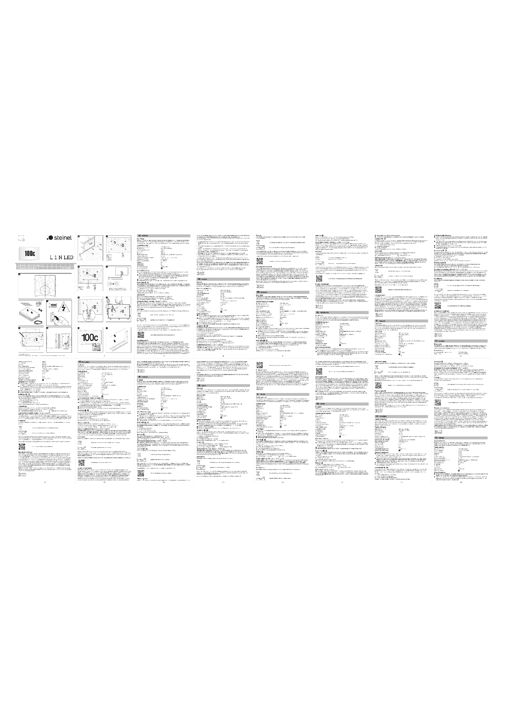 WARRANTY MANUFACTURER'S YEAR WARRANTY MANUFACTURER'S YEAR WARRANTY FR FRançais Le principe Ce luminaire à LED avec Night-Automatic enregistre la luminosité ambiante, allume automatiquement la lumière à la nuit tombante et l’éteint à l’aube. Que ce soit à la porte d’entrée, sur la terrasse ou dans un abri pour voitures, le luminaire est monté rapidement et prêt à fonctionner. Caractéristiques techniques Dimensions (H×l×P) : 195 x 300 x 56mm Raccordement au secteur : 220 - 240 V, 50/60 Hz Puissance absorbée (Pon): 4,90W Flux lumineux : 440lm Ecacité : 90lm/W Mode veille détecteur (Psb): 0,20W Température de couleur : 3 000 k (blanc chaud) Indice de rendu des couleurs : IRC = 82 Durée de vie moyenne de calcul: L70B50 à 25°C : >60 000h Uniformité des couleurs SDCM : valeur initiale : 3 Réglage du seuil de déclenchement : de 5 à 200 lx Indice de protection : IP 54 Classe de protection : II Résistance aux chocs : IK 07 Température ambiante : de -20à +40°C Répartition de l’intensité lumineuse : Consignes de sécurité ■ Pendant le montage, le câble à raccorder doit être hors tension. Il faut donc d’abord couper l’alimentation électrique et s’assurer de l’absence de tension à l’aide d’un testeur de tension. ■ L’installation de l’appareil implique une intervention sur le réseau électrique. et doit donc être eectuée par un professionnel conformément à la norme NF C-15100. (DE-VDE 0100, AT-ÖVE/ÖNORME8001-1, CH-SEV1000) ■ Utiliser uniquement des pièces de rechange d’origine. ■ Ne pas démonter l’appareil vous-même. Les réparations doivent être eectuées uniquement par un atelier spécialisé. Installation - Il n’est pas possible de remplacer la source lumineuse de cette applique. S’il fallait la remplacer (par ex. si elle est brûlée), il faut remplacer l’applique en entier. Luminaire pour le montage à l’extérieur. Il réagit uniquement à la lumière du jour. Le luminaire ne s’éteint pas dans les endroits sombres. L = fil conducteur de courant (généralement noir ou marron) N = neutre (généralement bleu) PE = conducteur de terre éventuel (vert/jaune) Attention : s’il y a un conducteur de terre, l’isoler avec du ruban adhésif. Fonctions Réglage du seuil de déclenchement / seuil de réaction (réglage d’usine 200 lx) : Seuil de réaction du détecteur réglable progressivement de 5 à 200 lx = fonctionnement crépuscule env. 200 lx. = fonctionnement nocturne env. 5 lx. Dysfonctionnements (Problèmes / Causes ➩ Solutions) Sans tension / Fusible défectueux, appareil hors circuit ➩ Changer le fusible défectueux, mettre l’inter- rupteur en circuit, vérifier le câble à l’aide d’un testeur de tension. La lampe ne s’allume pas / Luminosité ambiante encore trop forte ➩ Attendre que le seuil de réaction soit atteint ou régler une nouvelle valeur. La lampe ne s’éteint pas / Luminosité ambiante encore trop faible ➩ Attendre que le seuil de réaction soit atteint ou régler une nouvelle valeur. Recyclage Les appareils électriques, lesaccessoireset les emballages doivent êtresoumis à un recyclage respectueux de l’environnement. Ne pas jeter les appareils électriques avec les ordures ménagères ! Important : il n’est pas possible de remplacer l’appareil. Uniquement pour les pays de l’UE : Conformément à la directive européenne en vigueur relative aux appareils électriques et électroniques usagés et à son application dans le droit national, les appareilsélectriques qui ne fonctionnent plus doiventêtrecollectés séparément des ordures ménagères et doiventfairel’objetd’un recyclage écologique. Classe d’ecacité énergétique : ce produit contient une source de classe d’ecacité énergétique « E ». Documentation technique sur le site Internetwww.steinelfrance.com Garantie du fabricant Ce produit STEINEL a été fabriqué avec le plus grand soin. Son fonctionnement et sa sécurité ont été contrôlés suivant des procédures fiables et il a été soumis à un contrôle final par sondage. STEINEL garantit un état et un fonctionnement irréprochables. La durée de garantie est de 36 mois et débute au jour de la vente au consommateur. Nous remédions aux défauts provenant d’un vice de matière ou de construction. La garantie sera assurée à notre discrétion par réparation ou échange des pièces défectueuses. La garantie ne s’applique ni aux pièces d’usure, ni aux dommages et défauts dus à une utilisation ou maintenance incorrecte. Les dommages consécutifs causés à d’autres objets sont exclus de la garantie. La garantie ne s’applique que si l’appareil non démonté est retourné à la station de service après-vente la plus proche, dans un emballage adéquat, accompagné d’une brève description du défaut et d’un ticket de caisse ou d’une facture portant la date d’achat et le cachet du vendeur. Service après-vente : Le service après-vente de notre usine eectue également les réparations non couvertes par la garantie ou survenant après l’expiration de celle-ci. Veuillez envoyer le produit correctement emballé à la station de service après-vente la plus proche.