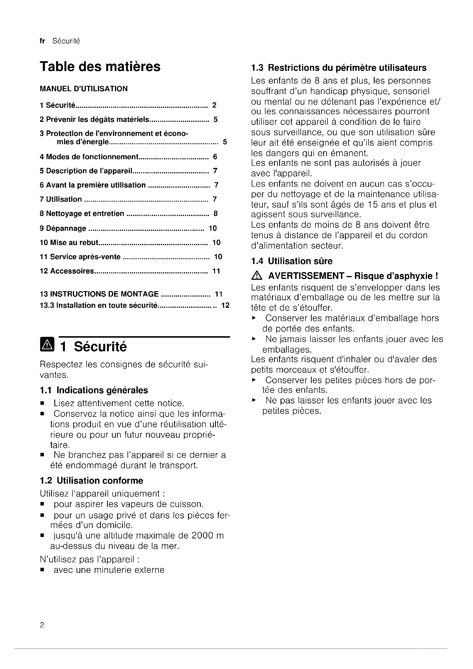 1 Sécurité Respectez les consignes de sécurité sui- vantes. 1.1 Indications générales ¡ Lisez attentivement cette notice. ¡ Conservez la notice ainsi que les informa- tions produit en vue d’une réutilisation ulté- rieure ou pour un futur nouveau proprié- taire. ¡ Ne branchez pas l’appareil si ce dernier a été endommagé durant le transport. 1.2 Utilisation conforme Utilisez l‘appareil uniquement: ¡ pour aspirer les vapeurs de cuisson. ¡ pour un usage privé et dans les pièces fer- mées d’un domicile. ¡ jusqu'à une altitude maximale de 2000m au-dessus du niveau de la mer. N’utilisez pas l’appareil: ¡ avec une minuterie externe 1.3 Restrictions du périmètre utilisateurs Les enfants de 8 ans et plus, les personnes souffrant d’un handicap physique, sensoriel ou mental ou ne détenant pas l’expérience et/ ou les connaissances nécessaires pourront utiliser cet appareil à condition de le faire sous surveillance, ou que son utilisation sûre leur ait été enseignée et qu’ils aient compris les dangers qui en émanent. Les enfants ne sont pas autorisés à jouer avec l'appareil. Les enfants ne doivent en aucun cas s’occu- per du nettoyage et de la maintenance utilisa- teur, sauf s’ils sont âgés de 15ans et plus et agissent sous surveillance. Les enfants de moins de 8ans doivent être tenus à distance de l’appareil et du cordon d’alimentation secteur. 1.4 Utilisation sûre AVERTISSEMENT‒Risque d'asphyxie! Les enfants risquent de s’envelopper dans les matériaux d’emballage ou de les mettre sur la tête et de s’étouffer. ▶ Conserver les matériaux d’emballage hors de portée des enfants. ▶ Ne jamais laisser les enfants jouer avec les emballages. Les enfants risquent d'inhaler ou d'avaler des petits morceaux et s'étouffer. ▶ Conserver les petites pièces hors de por- tée des enfants. ▶ Ne pas laisser les enfants jouer avec les petites pièces.Sécurité fr