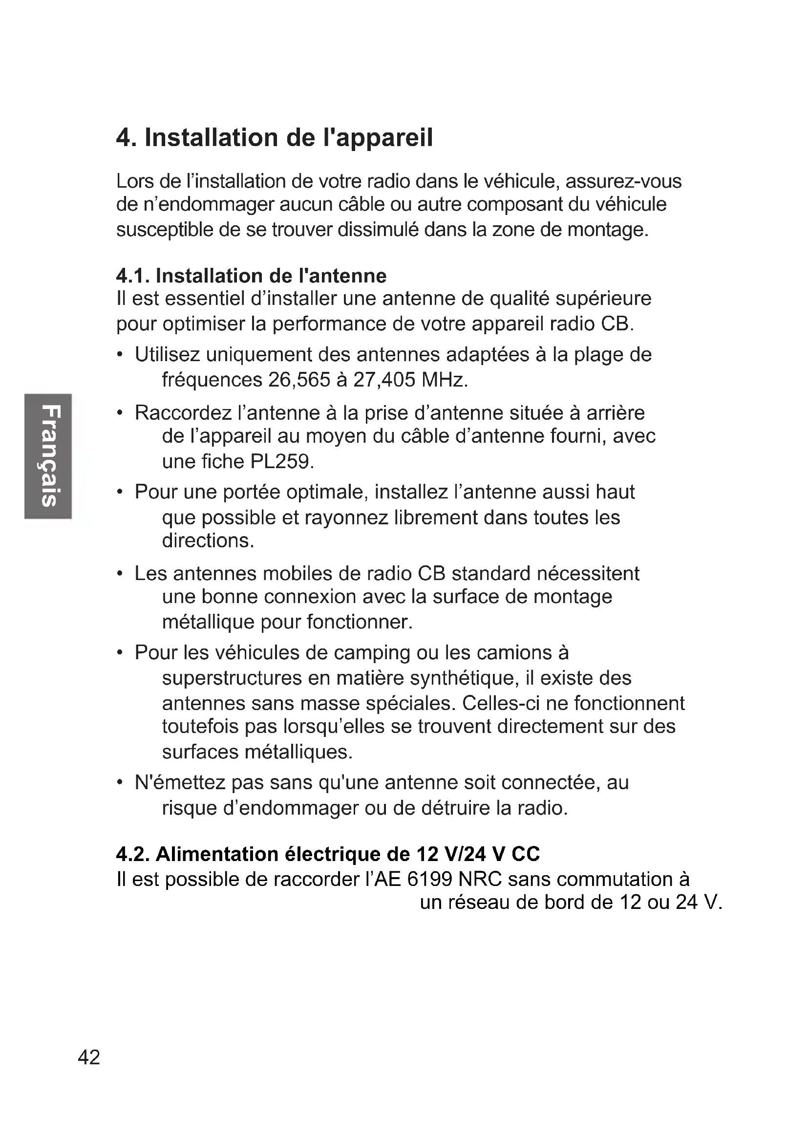 - N'émettez pas sans qu'une antenne soit connectée, au risque d’endommager ou de détruire la radio. 4.2. 4.2. Alimentation électrique de 12 V/24 V CCAlimentation électrique de 12 V/24 V CC Il est possible de raccorder l’AE 6199 NRC sans commutation à Il est possible de raccorder l’AE 6199 NRC sans commutation à un réseau de bord de 12 ou 24 V.un réseau de bord de 12 ou 24 V.43 Français