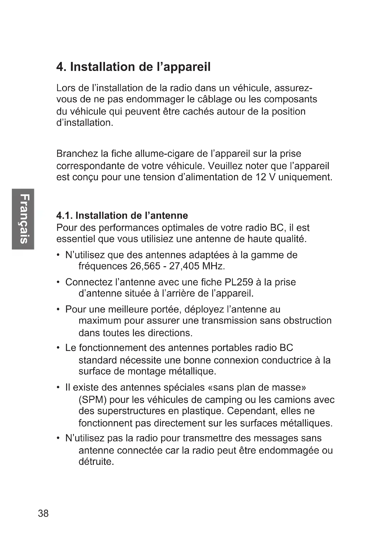 Lors de l’installation de la radio dans un véhicule, assurez- vous de ne pas endommager le câblage ou les composants du véhicule qui peuvent être cachés autour de la position d’installation. Branchez la che allume-cigare de l’appareil sur la prise correspondante de votre véhicule. Veuillez noter que l’appareil est conçu pour une tension d’alimentation de 12 V uniquement. 4.1. Installation de l’antenne Pour des performances optimales de votre radio BC, il est essentiel que vous utilisiez une antenne de haute qualité.