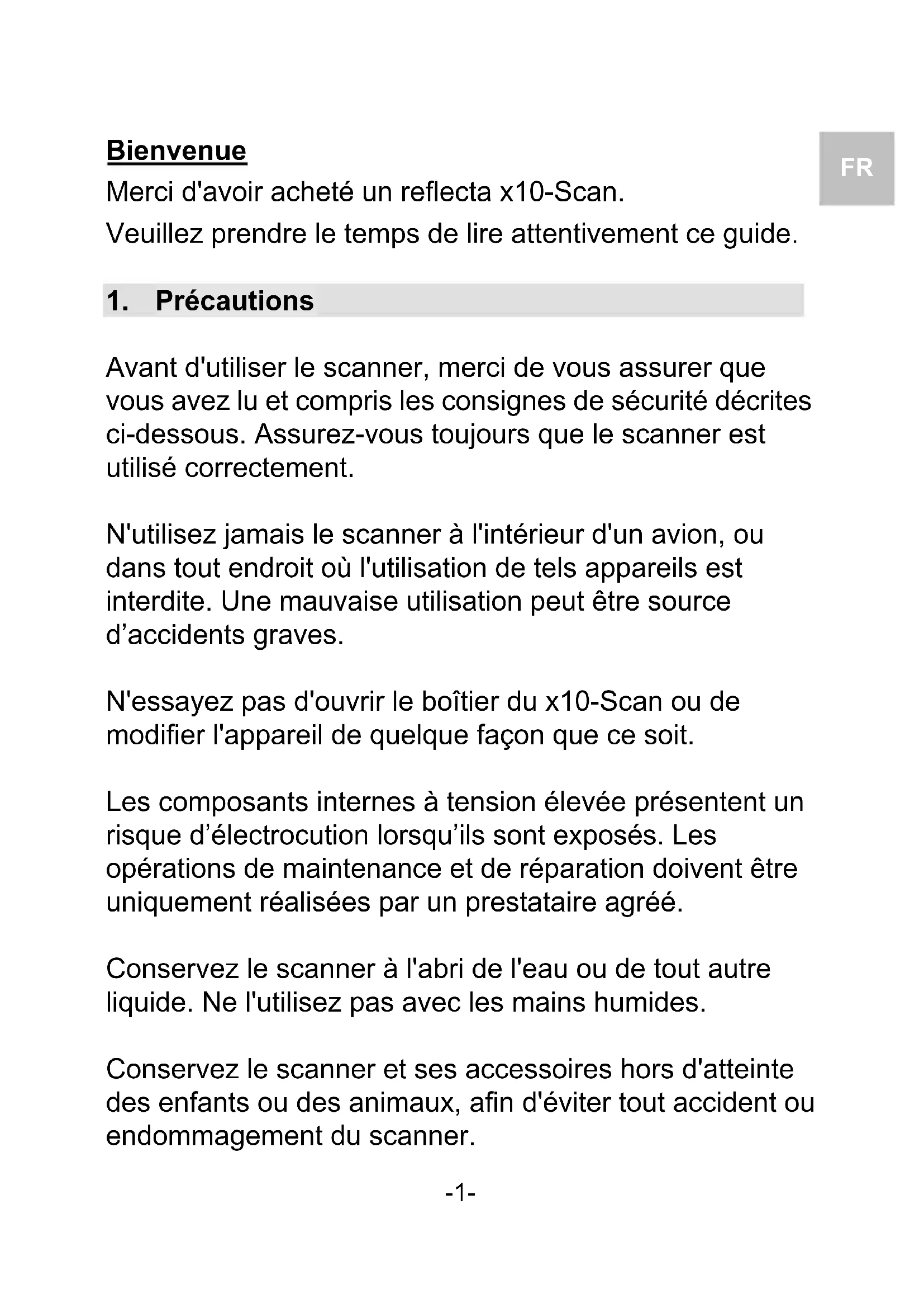 Avant d'utiliser le scanner, merci de vous assurer que vous avez lu et compris les consignes de sécurité décrites ci-dessous. Assurez-vous toujours que le scanner est utilisé correctement. N'utilisez jamais le scanner à l'intérieur d'un avion, ou dans tout endroit où l'utilisation de tels appareils est interdite. Une mauvaise utilisation peut être source d’accidents graves. N'essayez pas d'ouvrir le boîtier du x10-Scan ou de modifier l'appareil de quelque façon que ce soit. Les composants internes à tension élevée présentent un risque d’électrocution lorsqu’ils sont exposés. Les opérations de maintenance et de réparation doivent être uniquement réalisées par un prestataire agréé. Conservez le scanner à l'abri de l'eau ou de tout autre liquide. Ne l'utilisez pas avec les mains humides. Conservez le scanner et ses accessoires hors d'atteinte des enfants ou des animaux, afin d'éviter tout accident ou endommagement du scanner.-2-
