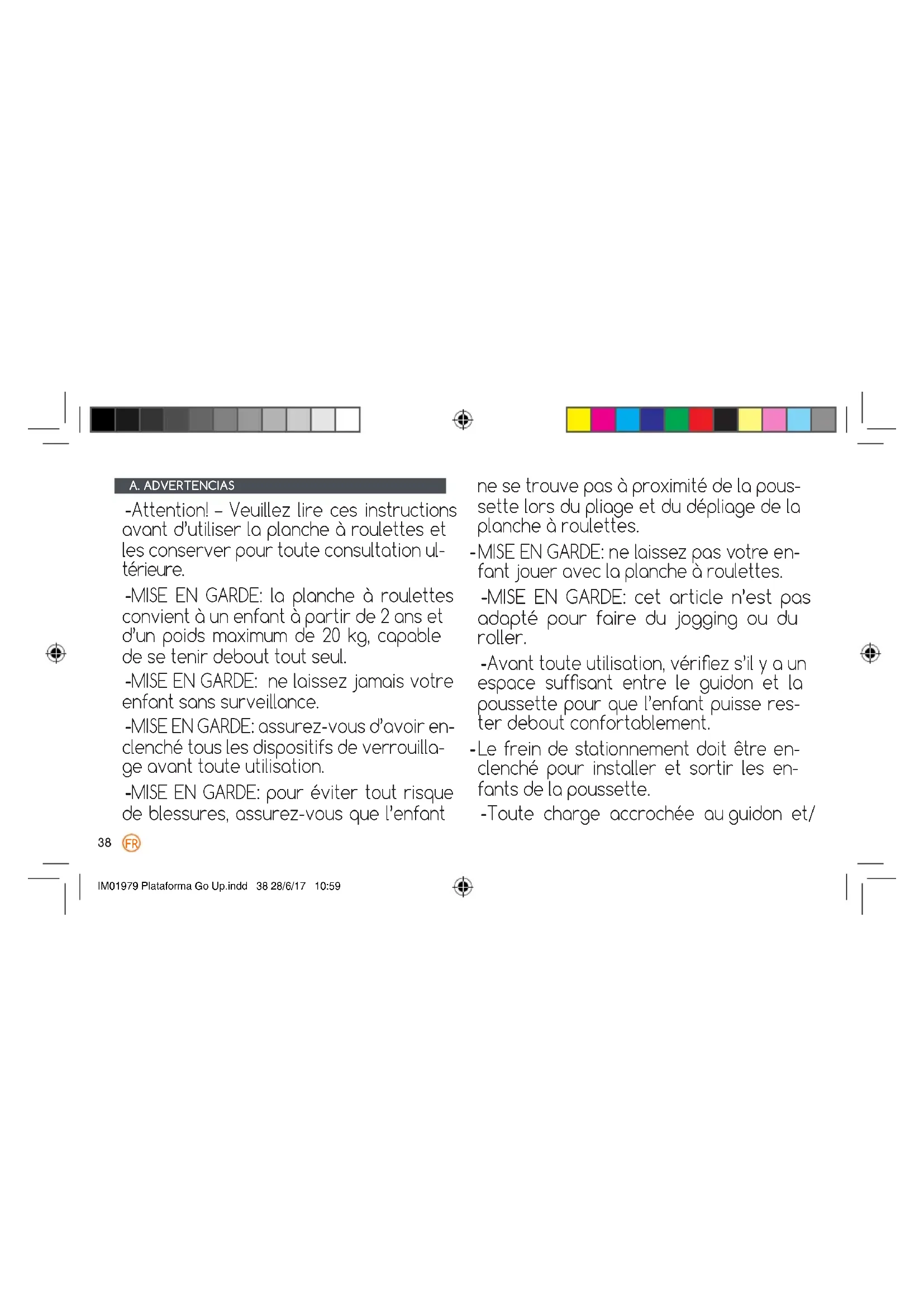A. ADVERTENCIAS -Attention! – Veuillez lire ces instructions avant d’utiliser la planche à roulettes et les conserver pour toute consultation ul- térieure. -MISE EN GARDE: la planche à roulettes convient à un enfant à partir de 2 ans et d’un poids maximum de 20 kg, capable de se tenir debout tout seul. -MISE EN GARDE: ne laissez jamais votre enfant sans surveillance. -MISE EN GARDE: assurez-vous d’avoir en- clenché tous les dispositifs de verrouilla- ge avant toute utilisation. -MISE EN GARDE: pour éviter tout risque de blessures, assurez-vous que l’enfant ne se trouve pas à proximité de la pous- sette lors du pliage et du dépliage de la planche à roulettes. -MISE EN GARDE: ne laissez pas votre en- fant jouer avec la planche à roulettes. -MISE EN GARDE: cet article n’est pas adapté pour faire du jogging ou du roller. -Avant toute utilisation, vériez s’il y a un espace sufsant entre le guidon et la poussette pour que l’enfant puisse res- ter debout confortablement. -Le frein de stationnement doit être en- clenché pour installer et sortir les en- fants de la poussette. -Toute charge accrochée au guidon et/ IM01979 Plataforma Go Up.indd 38 28/6/17 10:5939