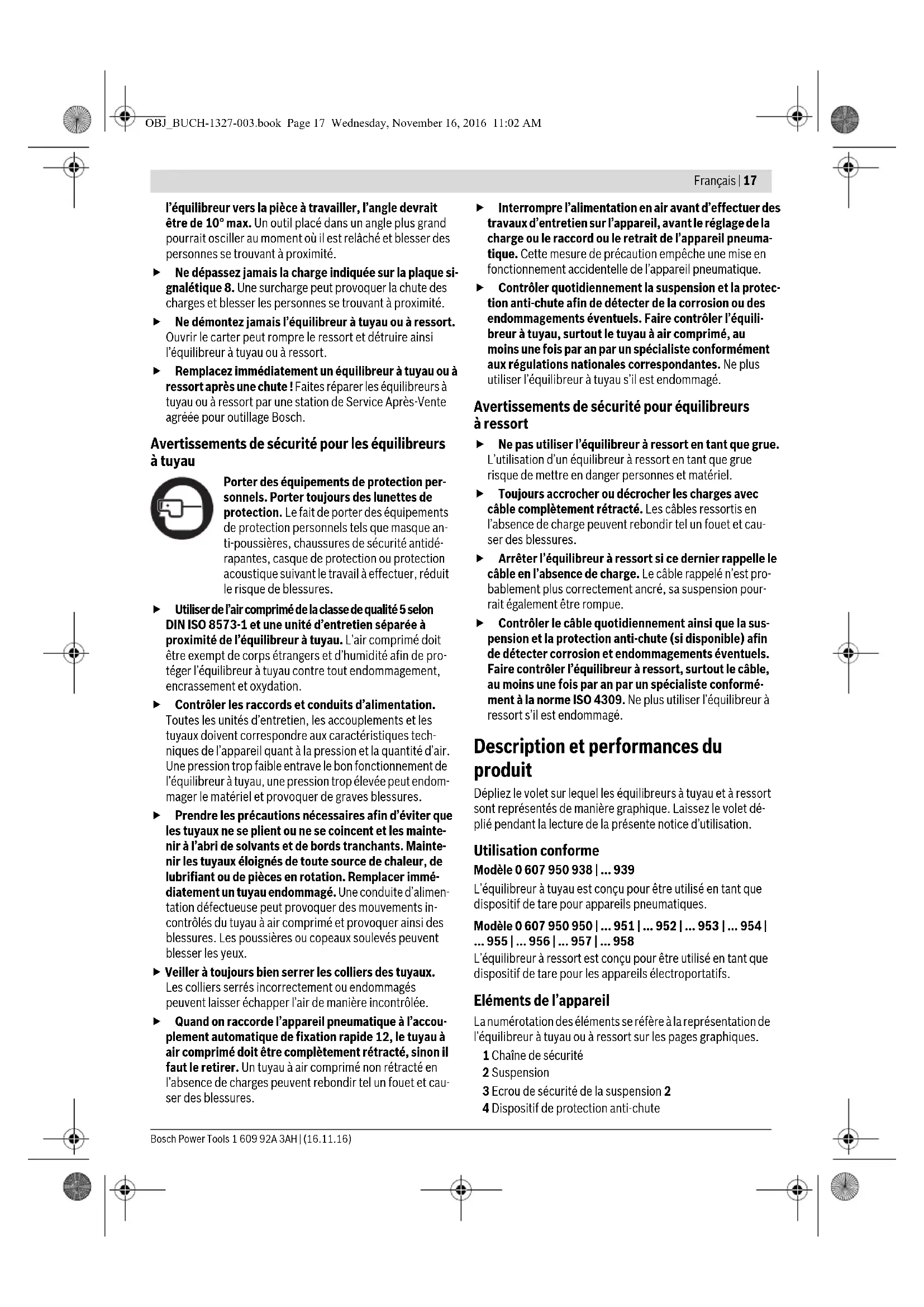 - Réglez d’abord la charge (voir « Réglage de la charge pour les équilibreurs à ressort », page 20). Desserrez les vis sur le serre-câble 32. Réglez le câble 25 sur la longueur souhaitée et resserrez les vis sur le serre-câble 32. La butée élastique de rétraction du câble 26 se laisse dépla- cer manuellement. Réglage de la charge pour les équilibreurs à tuyaux Ne dépassez pas la charge minimale et maximale indi- quée (voir « Caractéristiques Techniques »). Dépasser la plage de résistance provoque l’endommagement du res- sort se trouvant dans le carter. Première installation Pour ménager les équilibreurs à tuyau, ils ont été réglés en usine sur une charge minimale. Fixer une charge pourrait entraîner le déroulement complet du tuyau et causer endommagements et blessures. Après avoir accroché l’équilibreur à tuyau, réglez ce dernier en état hors charge sur la force de retour maximale (voir « Réglage de la force de retour »). La force de retour peut être ensuite adaptée à la charge sus- pendue. Réglage de la force de retour Raccordez l’appareil pneumatique à l’équilibreur à tuyau (voir « Raccordement de l’appareil pneumatique à l’équilibreur à tuyau », page 19). Afin de réduire la force de retour, placez la clé mâle pour vis à six pans creux 9 dans la vis de réglage de la charge 6, pous- sez la vis de réglage vers l’intérieur et tournez la clé mâle pour vis à six pans creux dans le sens inverse des aiguilles d’une montre jusqu’à ce qu’un équilibrage de la charge suspendue soit atteint. Afin d’augmenter la force de retour, placez la clé mâle pour vis à six pans creux 9 dans la vis de réglage de la charge 6, poussez la vis de réglage vers l’intérieur et tournez la clé mâle pour vis à six pans creux dans le sens des aiguilles d’une montre jusqu’à ce qu’un équilibrage de la charge suspendue soit atteint. – Pour modèle 0 607 950 938 4 tours max. – Pour modèle 0 607 950 939 2½ tours max. La force de retour est optimale quand l’appareil pneumatique se laisse tirer facilement dans la position souhaitée et re- tourne à sa position de départ après avoir été relâché. Réglage de la charge pour les équilibreurs à ressort Toujours accrocher ou décrocher les charges avec câble complètement rétracté. Les câbles ressortis en l’absence de charge peuvent rebondir tel un fouet et cau- ser des blessures. Ne dépassez pas la charge minimale et maximale indi- quée (voir « Caractéristiques Techniques »). Dépasser la plage de résistance provoque l’endommagement du res- sort se trouvant dans le carter. Les équilibreurs à ressort sont réglés en usine sur charge maximale. OBJ_BUCH-1327-003.book Page 20 Wednesday, November 16, 2016 11:02 AMFrançais | 21 Bosch Power Tools 1 609 92A 3AH | (16.11.16) Fixez la charge : – Pour les modèles 0 607 950 950, p. 951