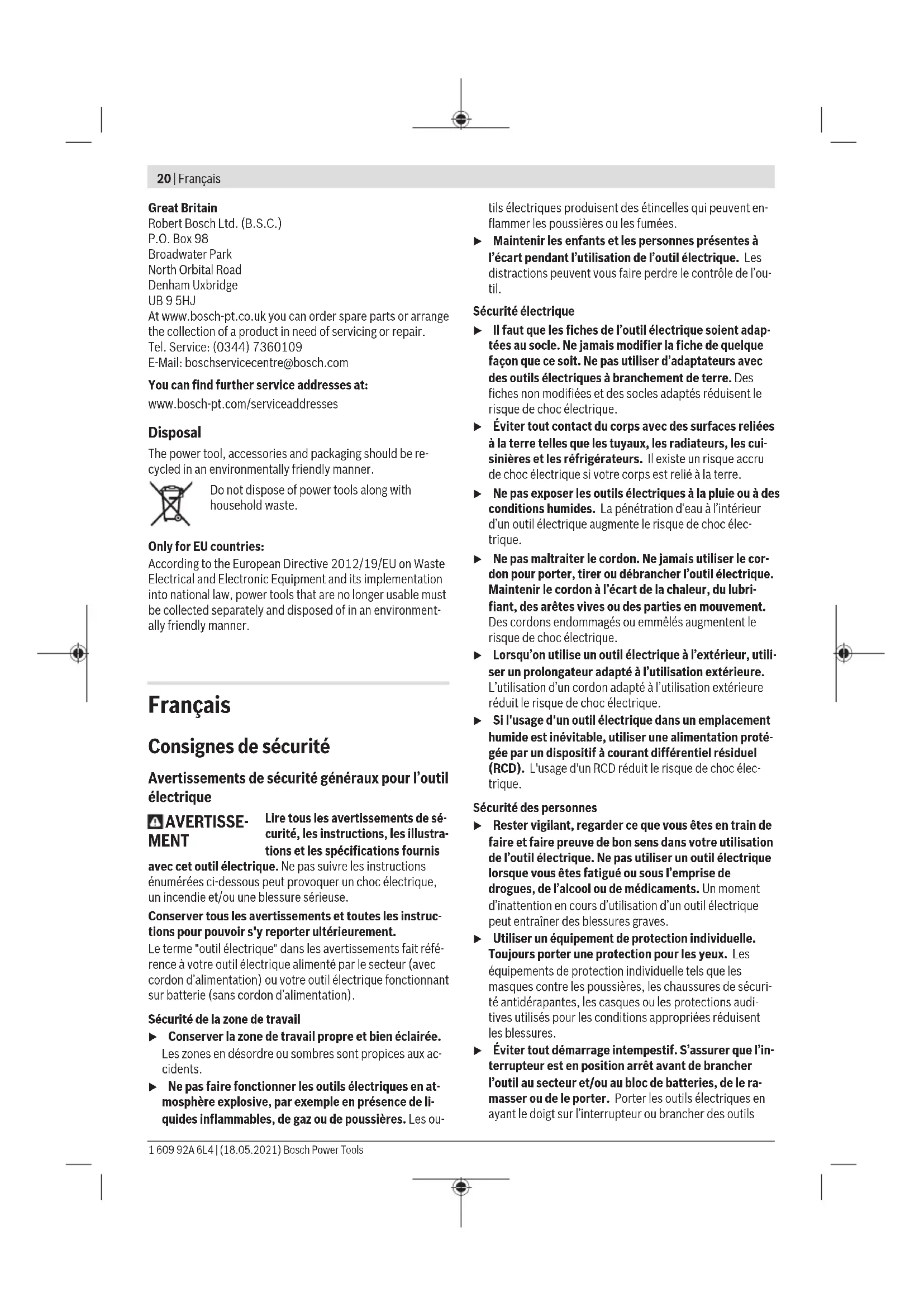Le niveau de vibration et la valeur d’émission sonore indi- qués dans cette notice d’utilisation ont été mesurés confor- mément à la norme et peuvent être utilisés pour une compa- raison entre les outils électroportatifs. Ils peuvent aussi ser- vir de base à une estimation préliminaire du taux de vibration et du niveau sonore. Le niveau de vibration et la valeur d’émission sonore indi- qués s’appliquent pour les utilisations principales de l’outil électroportatif. Si l’outil électroportatif est utilisé pour d’autres applications, avec d’autres accessoires de travail ou sans avoir fait l’objet d’un entretien régulier, le niveau de vi- bration et la valeur d’émission sonore peuvent différer. Il peut en résulter des vibrations et un niveau sonore nette- ment plus élevés pendant toute la durée de travail. Pour une estimation précise du niveau de vibration et du ni- veau sonore, il faut aussi prendre en considération les pé- riodes pendant lesquelles l’outil est éteint ou bien en marche sans être vraiment en action. Il peut en résulter au final un ni- veau de vibration et un niveau sonore nettement plus faibles pendant toute la durée de travail. Prévoyez des mesures de protection supplémentaires per- mettant de protéger l’utilisateur de l’effet des vibrations, par exemple: maintenance de l’outil électroportatif et des acces- soires de travail, maintien des mains au chaud, organisation des procédures de travail. Montage u Coupez l'alimentation électrique avant d'effectuer des réglages sur l'outil, de changer des accessoires ou de ranger l'outil électroportatif. De telles mesures de sécurité préventives réduisent le risque de démarrage ac- cidentel de l'outil. Fonctionnement et stockage L'outil électroportatif est exclusivement conçu pour une utili- sation dans des locaux fermés. L'outil est prévu pour fonctionner entre –5°C et +50°C (23°F et 122°F), avec un taux d'humidité relative de l'air compris entre 20 et 95% sans condensation. La visseuse droite électrique doit être stockée à une tempé- rature comprise entre –20°C (–4°F) et 70°C (158°F) pour éviter tout dommage aux composants électroniques. Dispositif de suspension L'étrier de suspension (8) permet de fixer l'outil électropor- tatif à un dispositif de suspension. u Contrôlez régulièrement l’état de l’étrier de suspen- sion et l’état du crochet du dispositif de suspension. Changement d'accessoire Montage d'un accessoire de travail Tirez le mandrin à serrage rapide (3) vers l'avant. Insérez l'accessoire de travail (1) dans le porte-outil (2) puis relâ- chez le mandrin à serrage rapide. N'utilisez que des accessoires dotés d'une queue adaptée (six pans mâle 1/4"). u Lors de la mise en place de l’accessoire de travail, veillez à bien le fixer sur le porte-outil. Si l’accessoire de travail n’est pas correctement fixé, il peut se détacher lors des vissages. 1 609 92A 6L4 | (18.05.2021) Bosch Power ToolsFrançais | 25 Retrait d'un accessoire de travail Tirez le mandrin à serrage rapide (3) vers l'avant. Retirez l'accessoire (1) du porte-outil (2), puis relâchez le mandrin à serrage rapide. Raccordement au secteur (voir figuresA - B) L'outil électroportatif est fourni sans bloc d'alimentation. Pour le raccordement au secteur, le bloc d'alimentation PUC- EXACT est nécessaire. u N'utilisez le bloc d'alimentation PUC-EXACT qu'avec les outils électroportatifs prévus à cet effet. L'utilisa- tion d'autres outils électriques peut endommager le bloc PUC-EXACT ainsi que ces outils eux-mêmes. u N'essayez jamais de raccorder l'outil électroportatif C-EXACT directement au secteur. N'utilisez pas de ral- longe de câble. Cela risquerait d'endommager l'outil électroportatif C-EXACT. u N'utilisez que des câbles d'origine! Avant chaque uti- lisation, assurez-vous que l'outil, les câbles et les fiches ne sont pas endommagés. Ne réparez jamais les câbles, changez-les. u Confiez tous les travaux de réparation et d’entretien à des personnes qualifiées. Ceci permet de préserver la sécurité d’utilisation de l’outil électroportatif. Reliez toujours d'abord l'outil électroportatif au bloc d'ali- mentation PUC-EXACT avant de raccorder le bloc d'alimenta- tion au secteur. Introduisez le câble d'outil (7) dans la prise de raccordement (13) du bloc d'alimentation PUC-EXACT. Veillez à ce que la rainure (15) située dans le connecteur du câble d'outil cor- responde à l'ergot dans la prise de raccordement. Vissez la douille (11) dans le sens horaire sur la prise de raccorde- ment. Pour les visseuses électriques droites à démarrage par le- vier, veillez à ne pas poser la visseuse sur le levier avant de raccorder le bloc d'alimentation PUC-EXACT au secteur. Cela permet d'éviter une mise en marche involontaire de la vis- seuse. Pour les visseuses électriques droites à démarrage par poussée, veillez à ne pas exercer de pression axiale sur la visseuse en raccordant le bloc d'alimentation PUC-EXACT au secteur. Cela permet d'éviter une mise en marche involon- taire de la visseuse. Enfoncez d'abord la fiche de raccordement (18) du câble secteur (19) dans la prise de raccordement (21) du bloc d'alimentation PUC-EXACT. Il est alors possible de connecter le bloc PUC-EXACT au secteur en enfonçant la fiche de sec- teur (20) dans une prise de courant avec mise à la terre. Commencez toujours par raccorder le câble secteur au bloc d'alimentation PUC-EXACT avant d'enfoncer la fiche de sec- teur (20) dans la prise de courant, afin d'éviter tout risque de choc électrique. Mise en marche Utiliser un équipement de protection indivi- duelle. Toujours porter une protection pour les yeux. Les équipements de protection indi- viduelle tels que les masques contre les pous- sières, les chaussures de sécurité antidéra- pantes, les casques ou les protections auditives utilisés pour les conditions appropriées réduisen