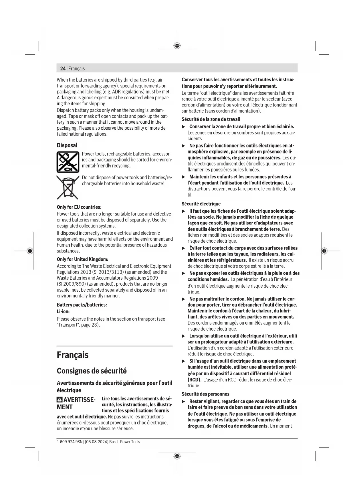 To label individually set torques, you can replace the mark- ing ring (17) with a marking ring of a different colour. – Push the marking ring(17) with a thin screwdriver blade, a spatula or similar implement. Switching on/off The screwdrivers have a torque-dependent shut-off clutch that can be set to a value in the specified range. It responds when the set torque is reached. – To switch on the power tool, press the on/off switch(10) as far as it will go. – The power tool will switch off automatically when the set torque is reached. u If the on/off switch (10) is released too early, the pre- set torque will not be reached. 1 609 92A 9SN | (06.08.2024) Bosch Power ToolsEnglish | 23 u Check the torque on the screw connection regularly and readjust the shut-off clutch if necessary. Switching on the worklight The worklight (13) illuminates the work area in poor lighting conditions. Switch on the worklight (13) by lightly pressing the on/off switch (10). If you press down harder on the on/ off switch, the power tool will switch on and the worklight will remain illuminated. u Do not look directly into the worklight; it can blind you. Practical advice u Only apply the power tool to the screw/nut when the tool is switched off. Rotating tool inserts can slip off. Screwdriving indicator (green/red LED) The shut-off clutch is triggered upon reaching the preset torque. The LED indicator (7) lights up green. If the preset torque has not been reached, the LED indicator (7) lights up red and the tool emits a sound. The screw must be driven in again. Repeat protection If the shut-off clutch is triggered while driving a screw, the motor will switch off. You will need to wait 0.7 seconds be- fore you can switch the tool on again. This prevents you from accidentally retightening screws that are already firmly in place. Maintenance and Service Maintenance and Cleaning u Before carrying out any work on the power tool (e.g. maintenance, tool change etc.), remove the battery from the power tool. There is risk of injury from uninten- tionally pressing the on/off switch. u To ensure safe and efficient operation, always keep the power tool and the ventilation slots clean. Lubricating the power tool Lubricant: Special gearbox grease (225 ml) Article number 3 605 430 009 Molykote grease Motor oil SAE 10/SAE 20 – Clean the gearbox with a mild solvent after the first 150 operating hours. Follow the solvent manufacturer's in- structions on use and disposal. Then lubricate the gear- box with Bosch special gearbox grease. Repeat the clean- ing process once every 300 operating hours after clean- ing has been carried out for the first time. – After driving 100,000 screws, oil the moving parts of the shut-off clutch with a couple of drops of SAE 10/SAE 20 motor oil. Lubricate the sliding and rolling parts with Mo- lykote grease. Use this occasion to check the clutch for wear to ensure that accuracy and reproducibility have not been affected. You will need to reset the clutch torque once you have done this. u Have maintenance and repair work performed exclus- ively by a qualified specialist. This will ensure that the safety of the power tool is maintained. An authorised Bosch after-sales service point will handle this work quickly and reliably. u Dispose of lubricants and cleaning products in an en- vironmentally friendly manner, taking legal regula- tions into account. u Check the entire power tool for damage and wear every 100,000 screw connections at the latest and check all functions. Then set the torque of the clutch again. After-Sales Service and Application Service Our after-sales service responds to your questions concern- ing maintenance and repair of your product as well as spare parts. You can find explosion drawings and information on spare parts at: www.bosch-pt.com The Bosch product use advice team will be happy to help you with any questions about our products and their accessor- ies. In all correspondence and spare parts orders, please always include the 10‑digit article number given on the nameplate of the product. Malaysia Robert Bosch Sdn. Bhd.(220975-V) PT/SMY No. 8A, Jalan 13/6 46200 Petaling Jaya Selangor Tel.: (03) 79663194 Toll-Free: 1800 880188 Fax: (03) 79583838 E-Mail: kiathoe.chong@my.bosch.com www.bosch-pt.com.my Great Britain Robert Bosch Ltd. (B.S.C.) P.O. Box 98 Broadwater Park North Orbital Road Denham Uxbridge UB 9 5HJ At www.bosch-pt.co.uk you can order spare parts or arrange the collection of a product in need of servicing or repair. Tel. Service: (0344) 7360109 E-Mail: boschservicecentre@bosch.com You can find further service addresses at: www.bosch-pt.com/serviceaddresses Transport The recommended lithium-ion batteries are subject to legis- lation on the transport of dangerous goods. The user can transport the batteries by road without further require- ments. Bosch Power Tools 1 609 92A 9SN | (06.08.2024)24 | Français When the batteries are shipped by third parties (e.g. air transport or forwarding agency), special requirements on packaging and labelling (e.g. ADR regulations) must be met. A dangerous goods expert must be consulted when prepar- ing the items for shipping. Dispatch battery packs only when the housing is undam- aged. Tape or mask off open contacts and pack up the bat- tery in such a manner that it cannot move around in the packaging. Please also observe the possibility of more de- tailed national regulations. Disposal Power tools, rechargeable batteries, accessor- ies and packaging should be sorted for environ- mental-friendly recycling. Do not dispose of power tools and batteries/re- chargeable batteries into household waste! Only for EU countries: Power tools that are no longer suitable for use and defective or used batteries must be disposed of separately. Use the designated collection systems. If disposed incorrectly, waste electrical and electronic equipment may have harmful effects on the environment and human health, due to the potential presence of haz