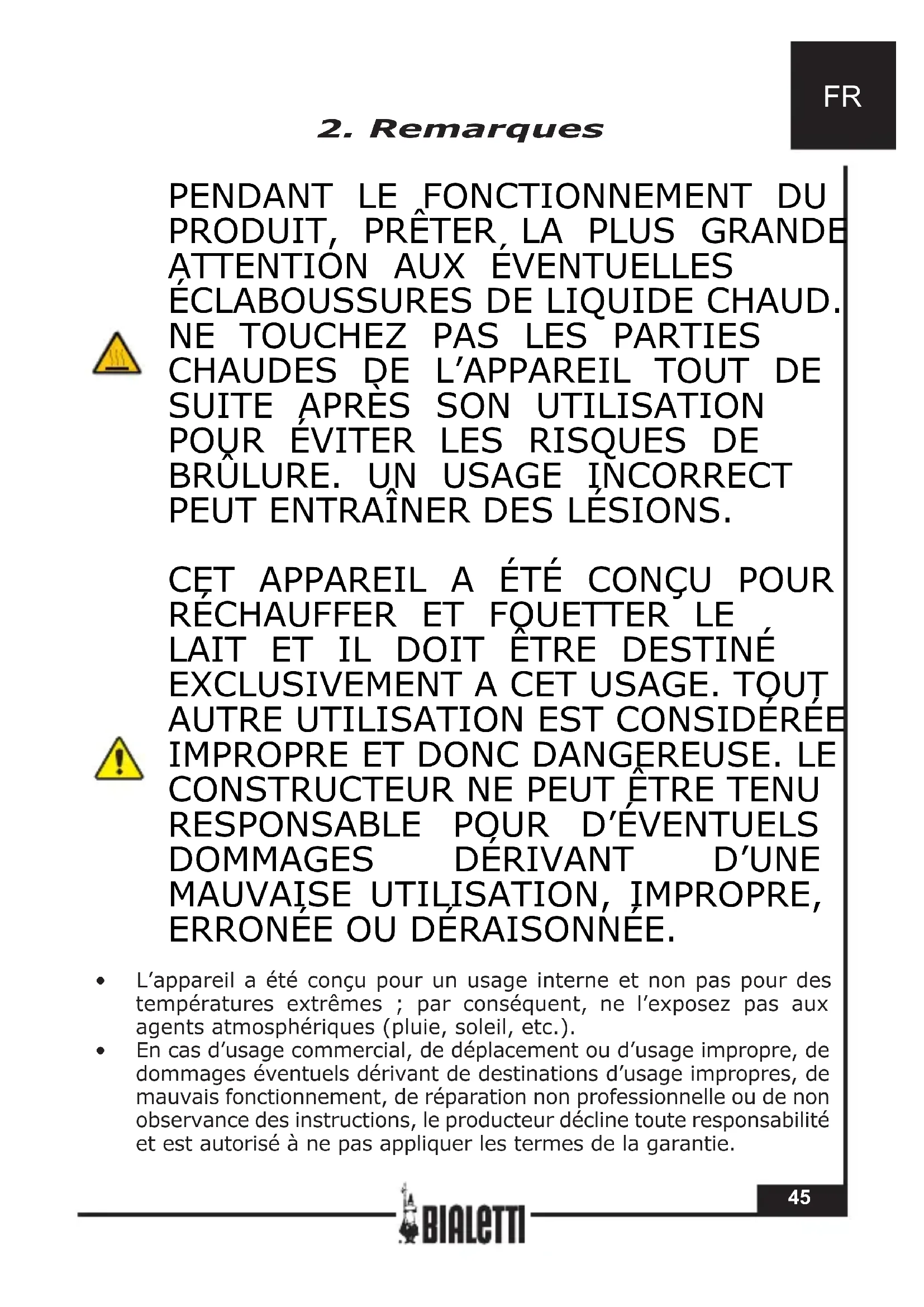- Dommages provoqués par des interventions effectuées par des centres de service après-vente non qualiés. La garantie est par ailleurs exclue dans tous les cas d’usage impropre de l’appareil et en cas d’usage professionnel. Bialetti décline toute responsabilité face aux éventuels dommages directs ou indirects envers les personnes, choses et animaux domestiques, dérivant de la non observation de toutes les prescriptions indiquées dans cette notice d’instructions en thème d’installation, d’usage et d’entretien de l’appareil. Exception faite pour les actions contractuelles de garantie envers le vendeur. LE FABRICANT SE RÉSERVE LE DROIT D’APPORTER À SES PRODUITS TOUTE MODIFICATION OPPORTUNE DICTÉE PAR DES RAISONS NORMATIVES, INDUSTRIELLES, COMMERCIALES OU ESTHÉTIQUES.FR