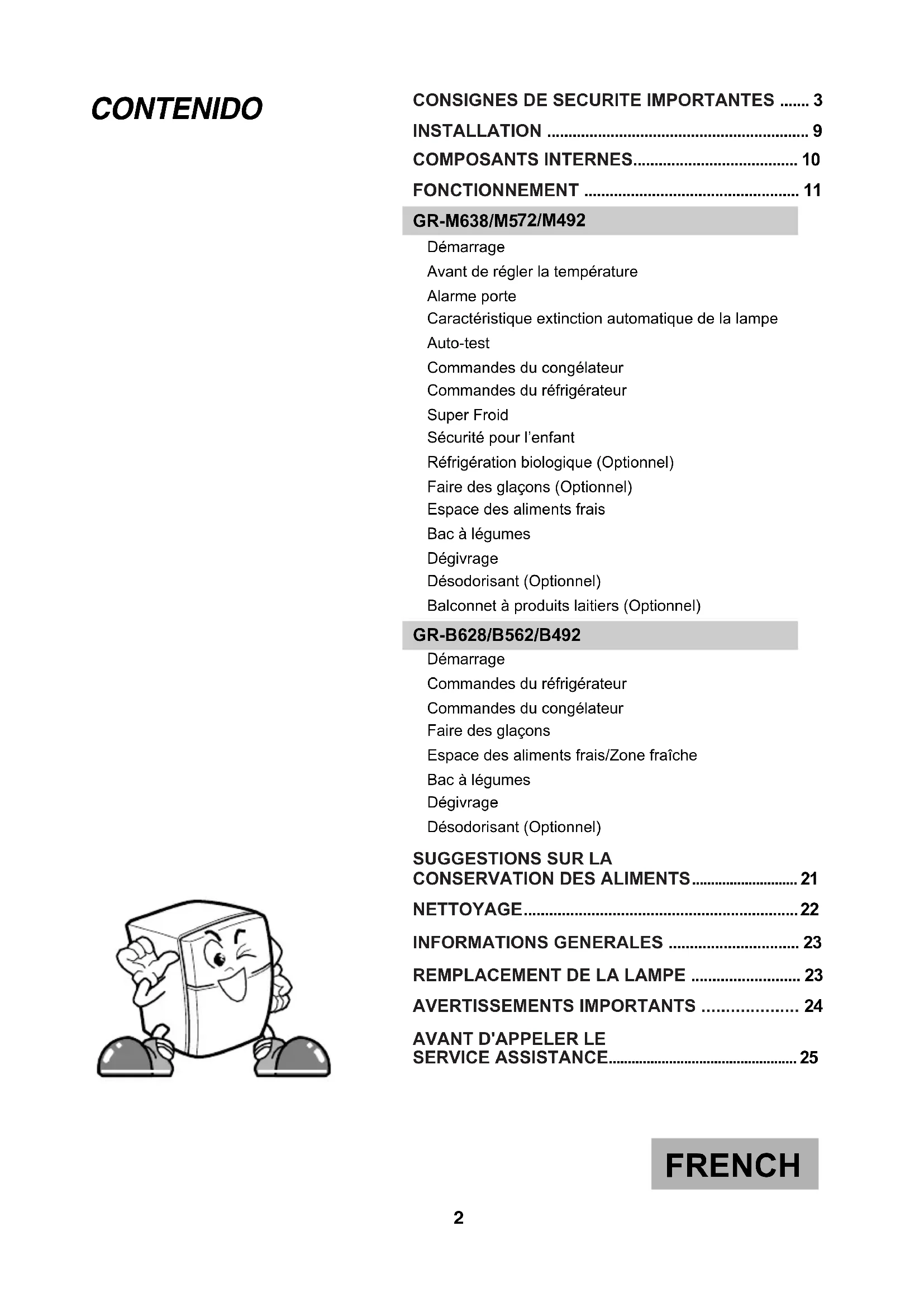 - FONCTIONNEMENT GR-M638/M572/M492 Démarrage Avant de régler la température Alarme porte Caractéristique extinction automatique de la lampe Auto-test Commandes du congélateur Commandes du réfrigérateur Super Froid Sécurité pour l’enfant Réfrigération biologique (Optionnel) Faire des glaçons (Optionnel) Espace des aliments frais Bac à légumes Dégivrage Désodorisant (Optionnel) Balconnet à produits laitiers (Optionnel) GR-B628/B562/B492 Démarrage Commandes du réfrigérateur Commandes du congélateur Faire des glaçons Espace des aliments frais/Zone fraîche Bac à légumes Dégivrage Désodorisant (Optionnel) p. 11