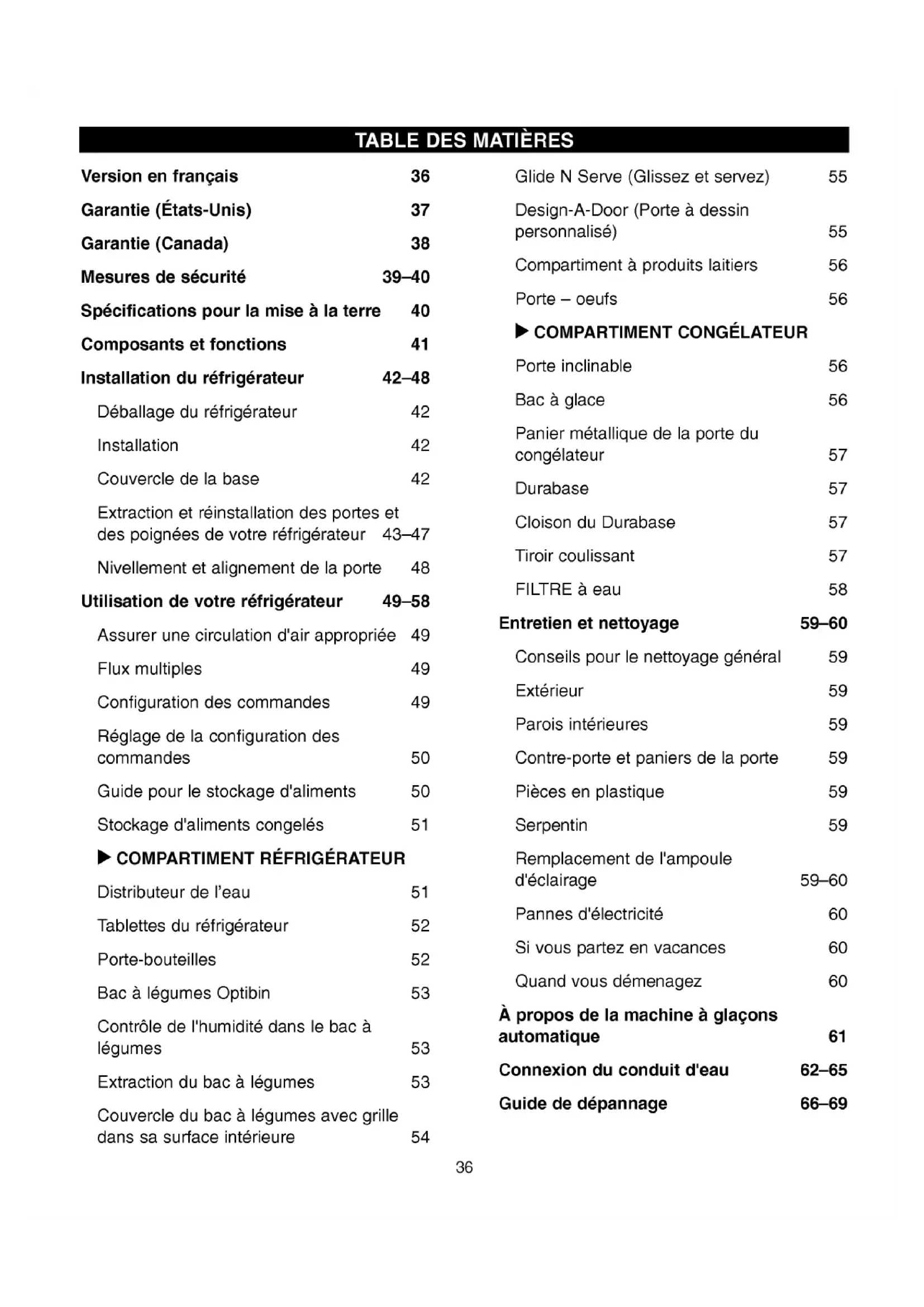 Versionen francais 36Garantie (Etats-Unis) 37Garantie (Canada) 38Mesuresdesecurite39--40 Specifications pourlamisealaterre40 Composants etfonctions41Installationdu refrigerateur 42--48 Deballage refrigerateur 42Installation42Couvercledelabase42Extraction reinstallationdes portes