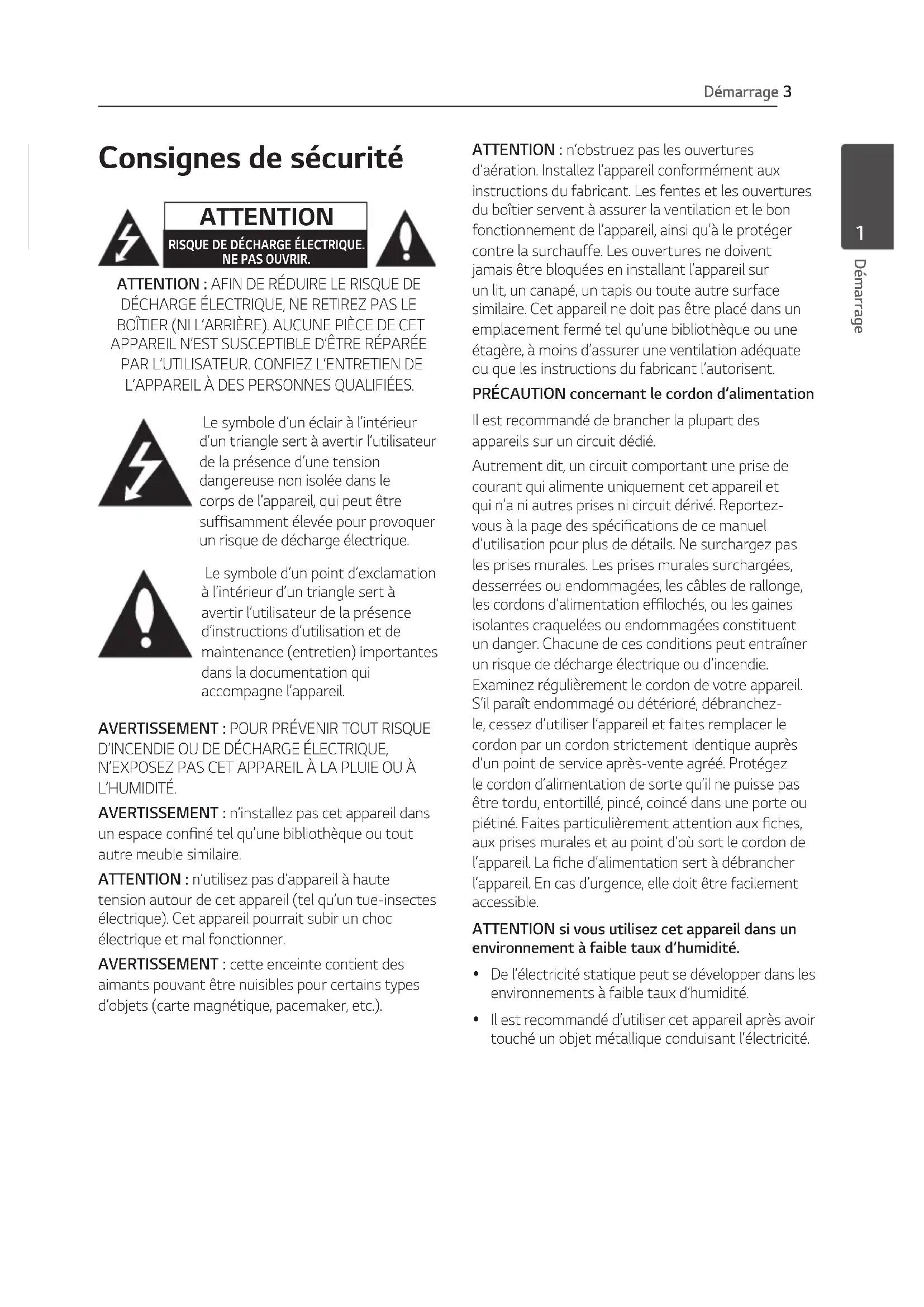 aimants pouvant être nuisibles pour certains types d’objets (carte magnétique, pacemaker, etc.). ATTENTION : n’obstruez pas les ouvertures d’aération. Installez l’appareil conformément aux instructions du fabricant. Les fentes et les ouvertures du boîtier servent à assurer la ventilation et le bon fonctionnement de l’appareil, ainsi qu’à le protéger contre la surchauffe. Les ouvertures ne doivent jamais être bloquées en installant l’appareil sur un lit, un canapé, un tapis ou toute autre surface similaire. Cet appareil ne doit pas être placé dans un emplacement fermé tel qu’une bibliothèque ou une étagère, à moins d’assurer une ventilation adéquate ou que les instructions du fabricant l’autorisent. PRÉCAUTION concernant le cordon d’alimentation Il est recommandé de brancher la plupart des appareils sur un circuit dédié. Autrement dit, un circuit comportant une prise de courant qui alimente uniquement cet appareil et qui n’a ni autres prises ni circuit dérivé. Reportez- vous à la page des spécications de ce manuel d’utilisation pour plus de détails. Ne surchargez pas les prises murales. Les prises murales surchargées, desserrées ou endommagées, les câbles de rallonge, les cordons d’alimentation eflochés, ou les gaines isolantes craquelées ou endommagées constituent un danger. Chacune de ces conditions peut entraîner un risque de décharge électrique ou d’incendie. Examinez régulièrement le cordon de votre appareil. S’il paraît endommagé ou détérioré, débranchez- le, cessez d’utiliser l’appareil et faites remplacer le cordon par un cordon strictement identique auprès d’un point de service après-vente agréé. Protégez le cordon d’alimentation de sorte qu’il ne puisse pas être tordu, entortillé, pincé, coincé dans une porte ou piétiné. Faites particulièrement attention aux ches, aux prises murales et au point d’où sort le cordon de l’appareil. La che d’alimentation sert à débrancher l’appareil. En cas d’urgence, elle doit être facilement accessible. ATTENTION si vous utilisez cet appareil dans un environnement à faible taux d’humidité.