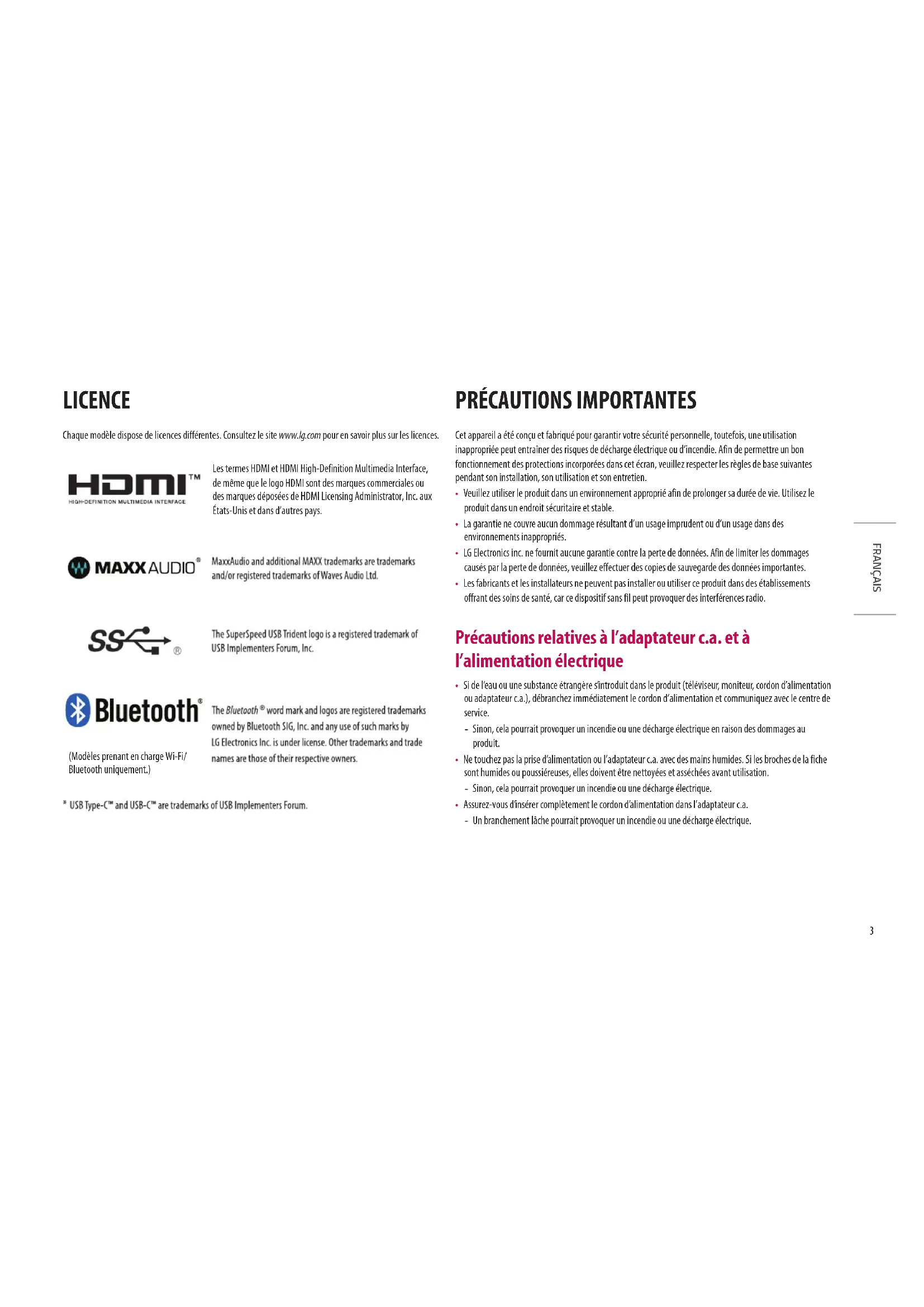 FRANÇAIS LICENCE Chaque modèle dispose de licences différentes. Consultez le site www.lg.com pour en savoir plus sur les licences. Les termes HDMI et HDMI High-Definition Multimedia Interface, de même que le logo HDMI sont des marques commerciales ou des marques déposées de HDMI Licensing Administrator, Inc. aux États-Unis et dans d’autres pays.