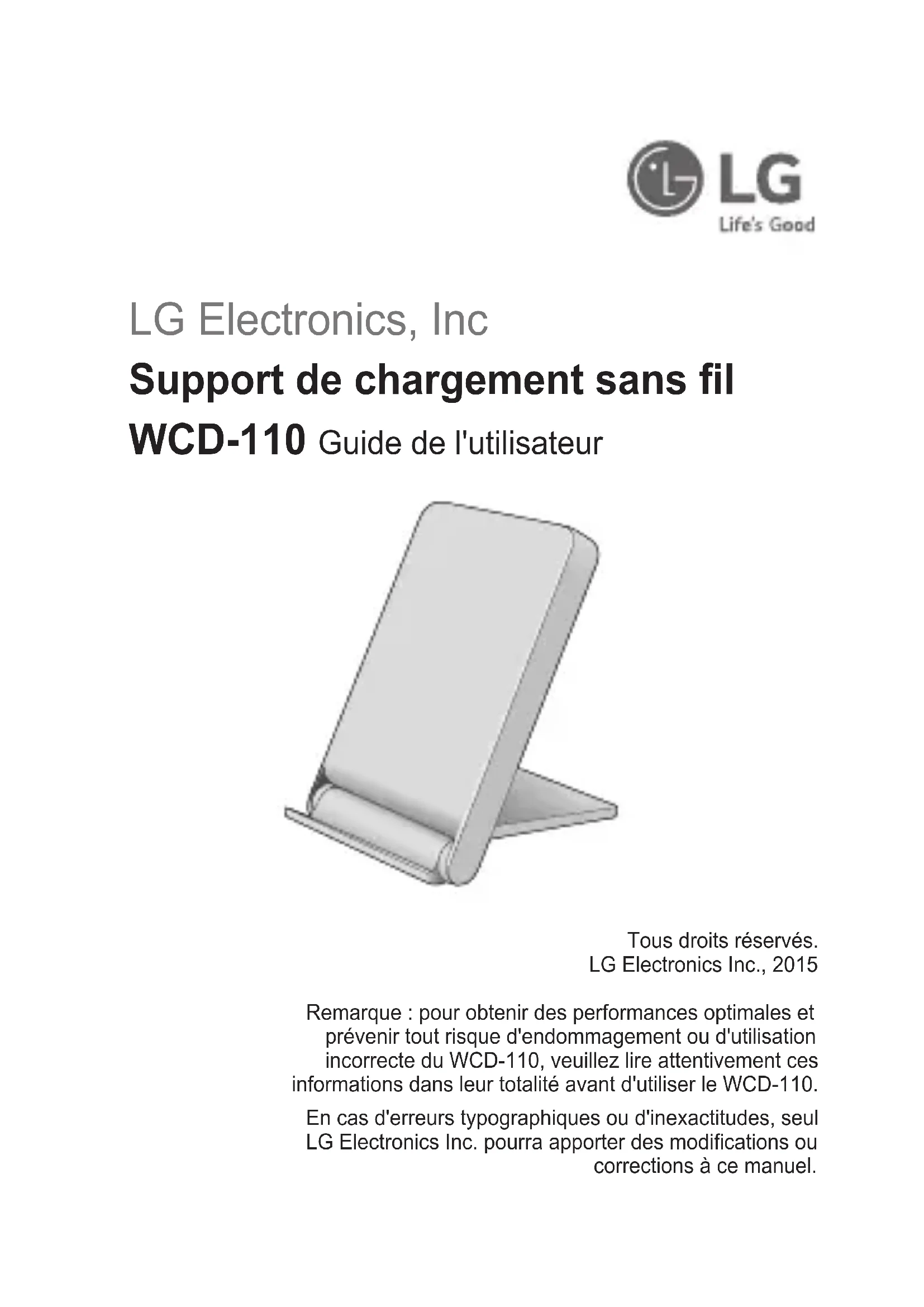 Consignes de sécurité Recyclage de votre ancien téléphone 1 Les éléments électriques et électroniques doivent être jetés séparément, dans les vide-ordures prévus à cet effet par votre municipalité ou être rapportés dans un magasin de téléphonie mobile. 2 Le recyclage de votre téléphone dans une poubelle appropriée ou dans un magasin de téléphonie mobile aidera à réduire les risques pour l’environnement et votre santé. 3 Pour plus d’informations concernant l’élimination de votre ancien appareil, veuillez contacter votre mairie, le service des ordures ménagères ou encore le magasin où vous avez acheté ce produit. Recyclage des batteries/accumulateurs usagés 1 Ce symbole peut être associé aux symboles chimiques du mercure (Hg), du cadmium (Cd) ou du plomb (Pb) si la batterie contient plus de 0,0005 % de mercure, 0,002 % de cadmium ou 0,004 % de plomb. 2 Les batteries/accumulateurs doivent être jetés séparément, dans les déchetteries prévues à cet effet par votre municipalité ou être rapportés dans un magasin de téléphonie mobile. 3 La mise au rebut de vos batteries/accumulateurs dans une poubelle appropriée ou dans un magasin de téléphonie mobile aidera à réduire les risques pour l’environnement et votre santé. 4 Pour plus d’informations concernant le recyclage de vos batteries/ accumulateurs, veuillez contacter votre mairie, le service des ordures ménagères ou encore le magasin où vous avez acheté ce produit.LG Electronics Inc. Drahtlose Ladehalterung WCD-110 Benutzerhandbuch Alle Rechte vorbehalten. LG Electronics Inc., 2015 Hinweis: Lesen Sie vor der Verwendung der WCD-110 alle Informationen sorgfältig durch, um einen optimalen Betrieb zu gewährleisten und Schäden an der WCD-110 sowie Bedienungsfehler zu vermeiden. Jegliche Änderungen an diesem Benutzerhandbuch aufgrund von Druckfehlern oder Ungenauigkeiten der enthaltenen Informationen dürfen nur von LG Electronics Inc. vorgenommen werden.DEU DEU
