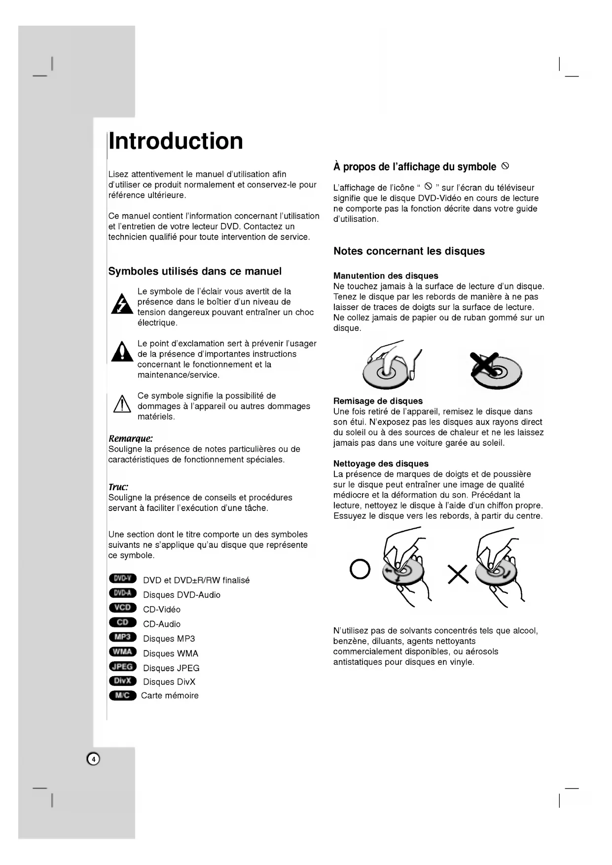 surl'ecranduteleviseur signifie quele disque DVD-Videoencoursdelecturene comporte paslafonctiondecritedansvotre guide d'utilisation. Notes concernant les disques Manutentiondes disques Netouchez jamais alasurfacedelectured'un disque. Tenezle disque parlesrebordsdemaniereanepaslaisserdetracesde doigts surlasurfacedelecture.Necollez jamais papier ouderuban gomme surun disque. Remisage disques Unefoisretirede l'appareil, remisezle disque danssonetui. N'exposez pasles disques auxrayonsdirectdusoleilouadessourcesdechaleuretneleslaissez jamais pasdansunevoiture garee ausoleil. Nettoyage des disques presence demarquesde doigts etde poussiere surle disque peut entrainerune image qualite mediocreetladeformationduson.Precedantla lecture, nettoyez disque al'aided'unchiffonpropre. Essuyez disque versles rebords, partir ducentre.N'utilisezpasdesolvantsconcentrestelsque alcool, benzene, diluants, agents nettoyants commercialement disponibles, ouaerosols antistatiques pour disques vinyle. M/C DivX JPEG WMA MP3 CDVCD DVD-A DVD-V Introduction5 Types disques utilisables Disques DVDvideo (disque 8cm/12 cm) Disques DVDaudio (disque 8cm/12 cm) CD-Video (VCD) (disque 8cm/12 cm) AudioCD (disque 8cm/12 cm) plus, cet appareil permet lalecturede disques Carte memoire, DivX, DVD -R, DVD +R, DVD -RW, DVD +RW, SVCDetCD-R/CD-RW comportant destitres audio, MP3, WMAet/oudesfichiersJPEG.Ceci indique unefonctiondu produit permettant deliredesDVD-RW enregistres auformat d'enregistrement video (Video Recording). Remarques: