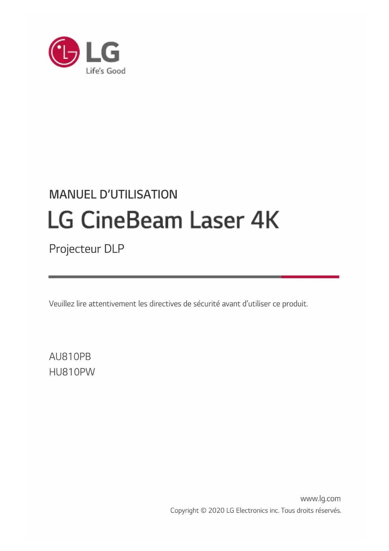 Projecteur DLP AU810PB HU810PW Veuillez lire attentivement les directives de sécurité avant d’utiliser ce produit. www.lg.com Copyright © 2020 LG Electronics inc. Tous droits réservés.2 FRANÇAIS CONTENU LICENCES 3 Informations sur les logiciels libres 4