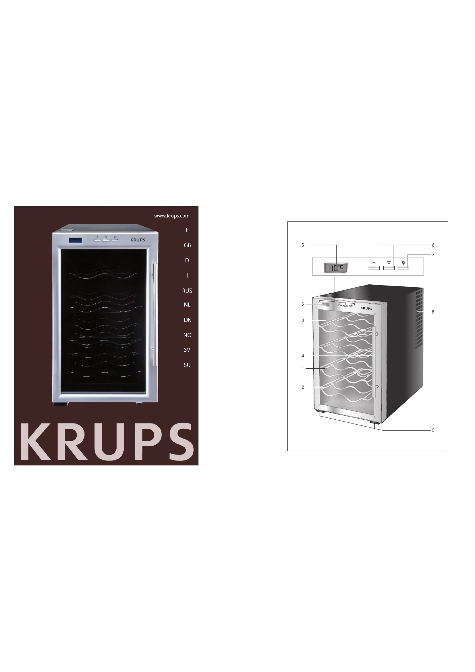 !!Français La Cave à vin de service KRUPS est destinée au stockage de bouteilles de vin dans la période qui précède leur ouverture. Cet appareil au design élégant a été conçu pour un usage domestique et n’est pas indiqué pour un usage intensif ou de longue durée. La fonction « service » est destinée à conserver de façon optimum vos bouteilles avant ouverture. En aucun cas cette cave ne permet de stocker des bouteilles pour de la maturation dans une durée qui excèderait un an. Attention : Le constructeur n’assume aucune responsabilité en cas de dommages provoqués par :