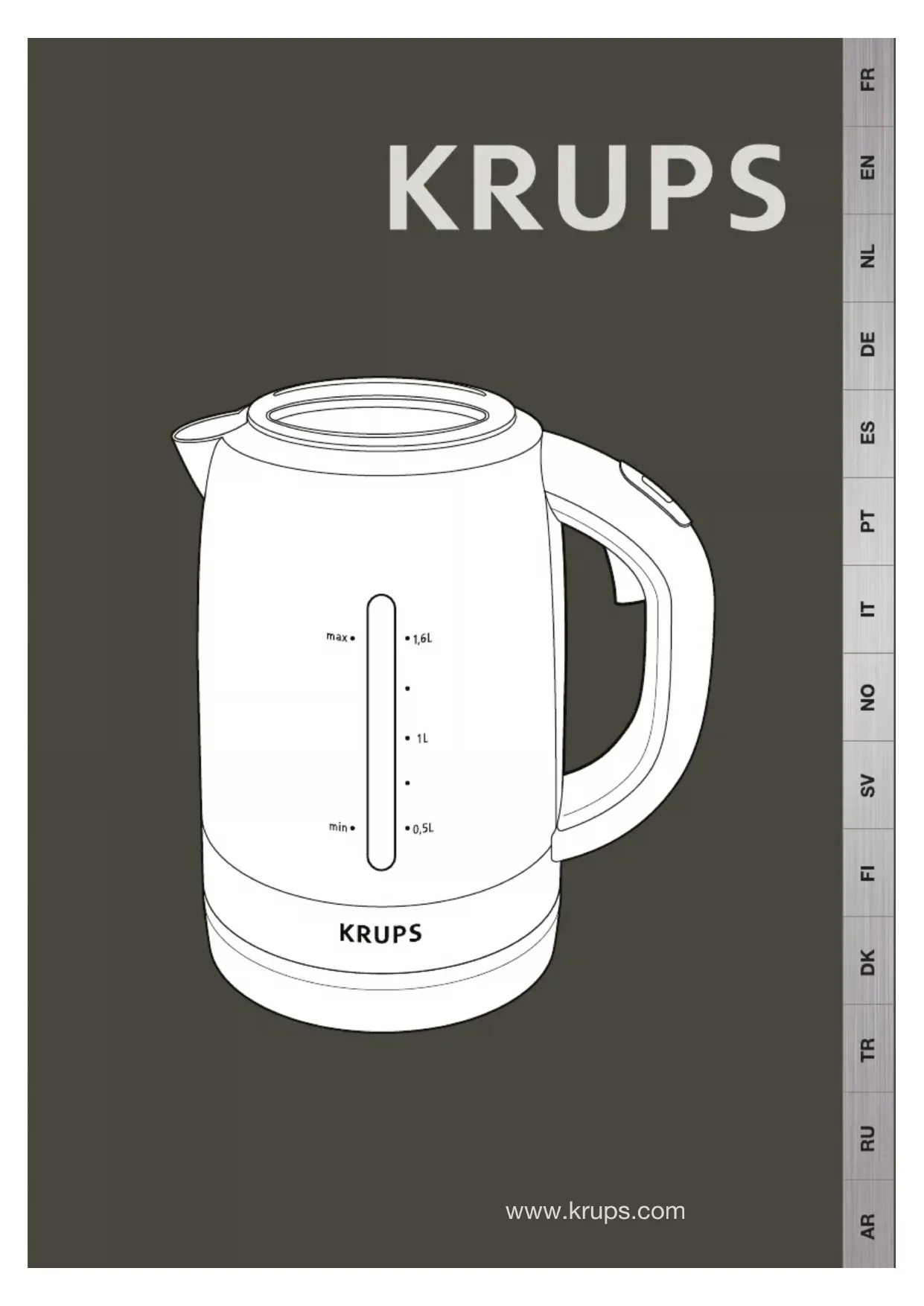 PROTECTION DE L’ENVIRONNEMENT! Vériez : le branchement que la bouilloire est bien positionnée sur son socle que l’interrupteur est en position marche en appuyant sur «I» que le couvercle est verrouillé en position «lock» et que la languette de protection obture bien le bec que la bouilloire n’a pas fonctionné sans eau. Sinon : Retirez la bouilloire de sa base, versez de l’eau froide dans l’appareil, et mettez à nouveau en marche. Si votre appareil fonctionne par intermittence avant l’ébullition ou s’arrête avant ébullition il est probablement entartré. Votre appareil ne fonctionne toujours pas? Adressez-vous à un centre service agréé KRUPS (voir liste dans le livret «KRUPS Service»). Débranchez l’appareil dès que vous cessez de l’utilisez et lorsque vous le nettoyez. Attention à vos déplacements avec la bouilloire lorsqu’elle contient de l’eau. Inclinez et versez lentement pour éviter tout risque de brûlure éventuelle par eau chaude. Eloignez les mains du bec verseur lorsque l’eau arrive à ébullition et évitez tout contact avec les surfaces chaudes de l’appareil. La directive Européenne 2012/19/UE sur les Déchets des Equipements Electriques et Electroniques (DEEE), exige que les appareils ménagers usagés ne soient pas jetés dans le ux normal des déchets municipaux. Les appareils usagés doivent êtres collectés séparément an d’optimiser le taux de récupération et le recyclage des matériaux qui les composent et réduire l’impact sur la santé humaine et l’environnement. Participons à la protection de l’environnement ! Votre appareil contient de nombreux matériaux valorisables ou recyclables. Conez celui-ci dans un point de collecte ou à défaut dans un centre service agréé pour que son traitement soit effectué. Si vous utiliser de l’acide citrique, toujours additionner avec de l’eau. Dans tous les cas, videz votre bouilloire puis rincez 5 à 6 fois. Ne jamais détartrer votre bouilloire à vide. Avant réutilisation, rincer à l’eau froide puis faire chauffer de l’eau (niveau maxi) deux fois en jetant l’eau avant de consommer.3 English Thank you for choosing an appliance from the KRUPS range which is intended exclusively for the heating of water. USE Place your kettle and its base on a at, stable, heat resistance surface. (1) Before rst use, rinse the inside of your kettle next ll it with cold water, boil and empty the kettle, repeat this a couple of times. Remove the lid by aligning the “” mark with the “open” position and lifting it off. (2) To close the kettle, engage the lid, with the spout cover set back, by placing the “” mark to “open” and turn it anti-clockwise to the “lock” position. The protective cover will block off the pouring spout. (3) With the kettle unplugged or removed from its base, ll it through the pouring spout while pressing the thumb-release latch or via the open lid, to between the min and max marks. (4) Close the lid (3), and place the kettle on its base. (5) Switch on by pressing the “I” switch. (6) The kettle stops automatically as soon as the water boils. (7) You can also switch the kettle off at any time during the heating process by pressing the “0” switch. (8) To pour, press the thumb-release latch under the handle. (9) Empty the water from your kettle completely after each use. CLEANING DE-SCALING To clean your kettle: Unplug it or remove it from its base. Leave it to cool, and then clean it with a damp sponge. To clean the filter (depends on the model): Clean the lter regularly. Rinse it in clean running water and using a soft, non-metallic brush if needed. Descale your kettle regularly. Use: