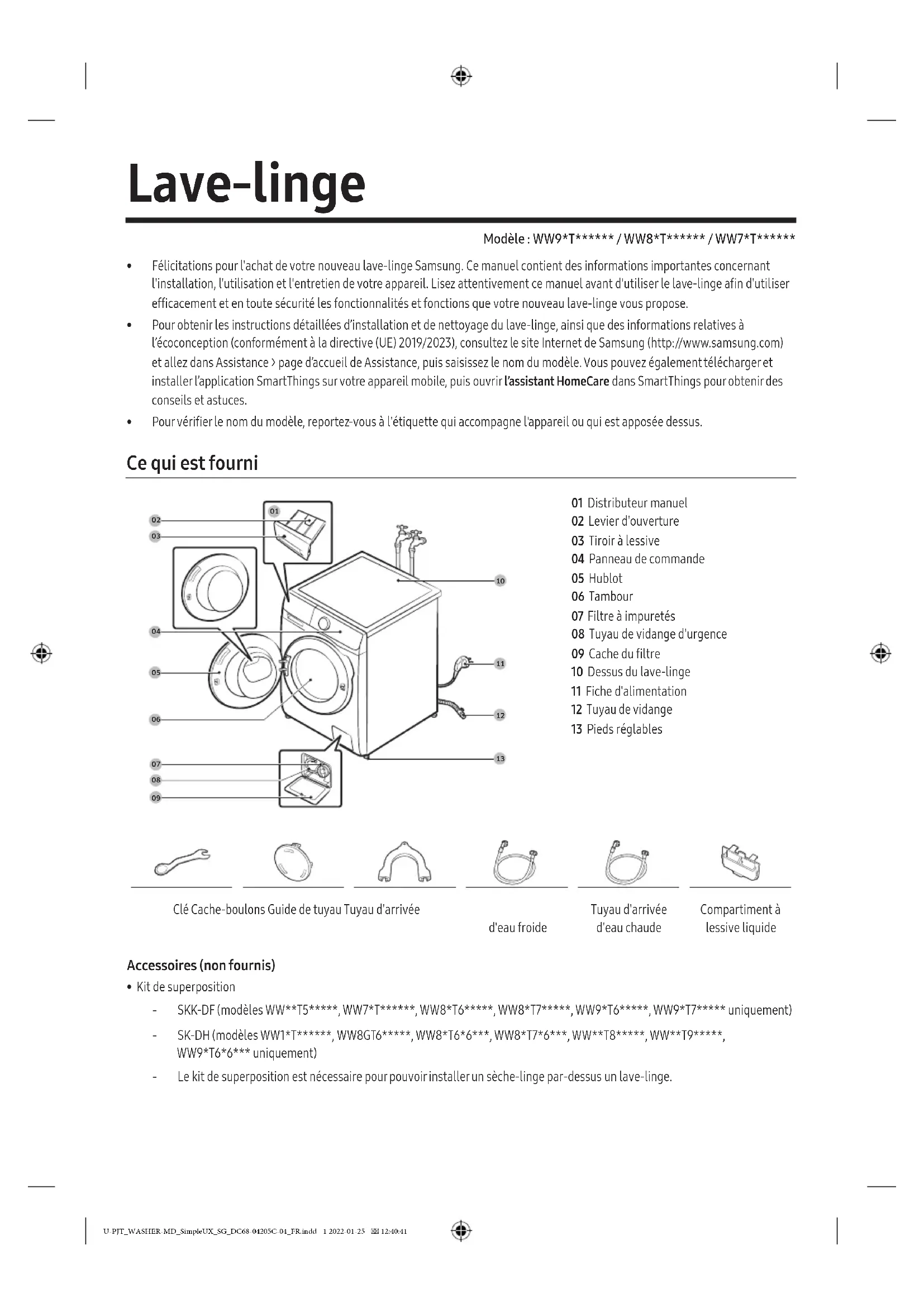 - Kit de superposition ‐ SKK-DF (modèles WW**T5*****, WW7*T******, WW8*T6*****, WW8*T7*****, WW9*T6*****, WW9*T7***** uniquement) ‐ SK-DH (modèles WW1*T******, WW8GT6*****, WW8*T6*6***, WW8*T7*6***, WW**T8*****, WW**T9*****, WW9*T6*6*** uniquement) ‐ Le kit de superposition est nécessaire pour pouvoir installer un sèche-linge par-dessus un lave-linge. U-PJT_WASHER-MD_SimpleUX_SG_DC68-04205C-04_FR.indd 1 2022-01-25 12:40:41Français2 Consignes de sécurité REMARQUE