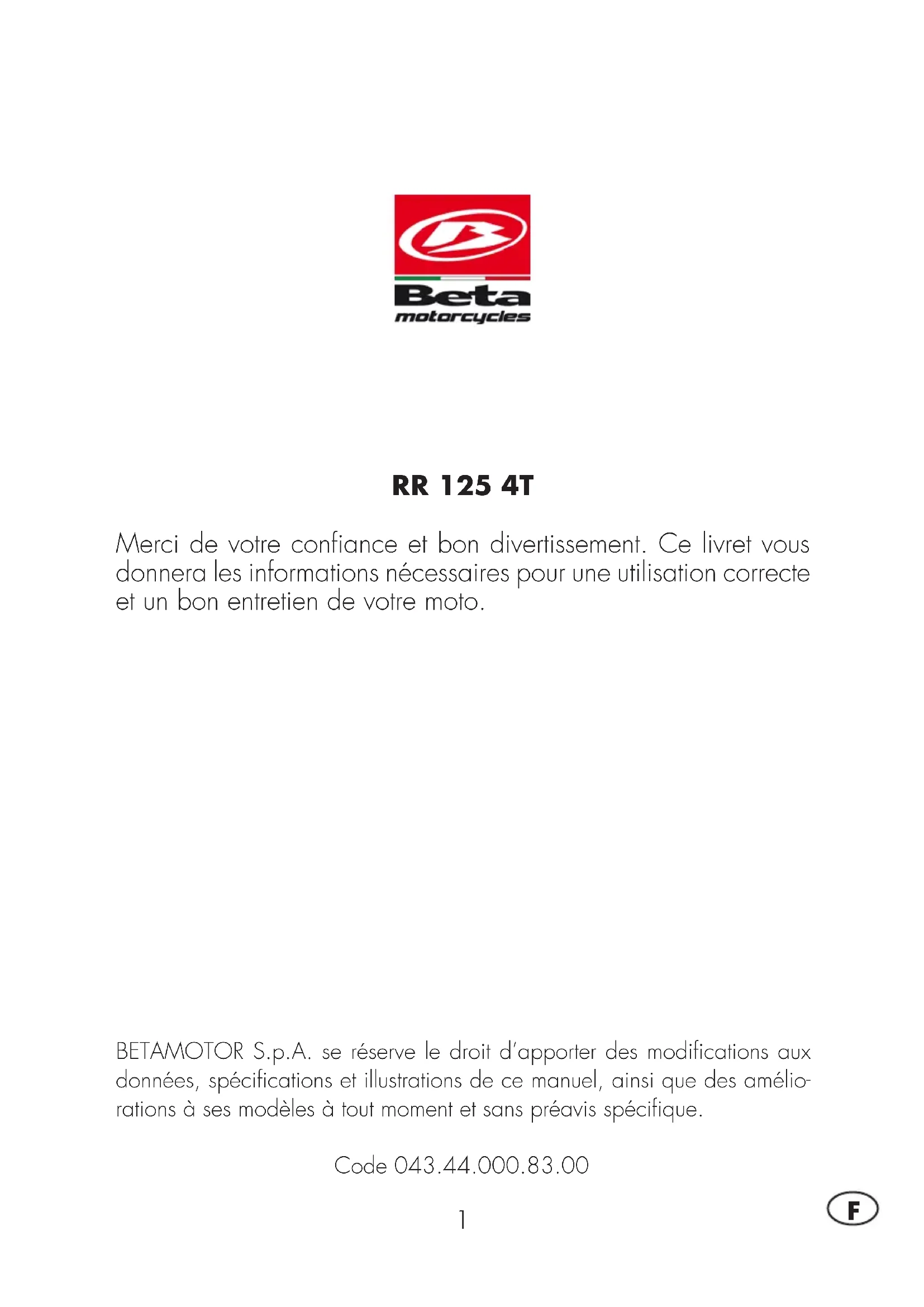 RR 125 4T Merci de votre confiance et bon divertissement. Ce livret vous donnera les informations nécessaires pour une utilisation correcte et un bon entretien de votre moto. BETAMOTOR S.p.A. se réserve le droit d’apporter des modifications aux données, spécifications et illustrations de ce manuel, ainsi que des amélio- rations à ses modèles à tout moment et sans préavis spécifique. Code 043.44.000.83.002