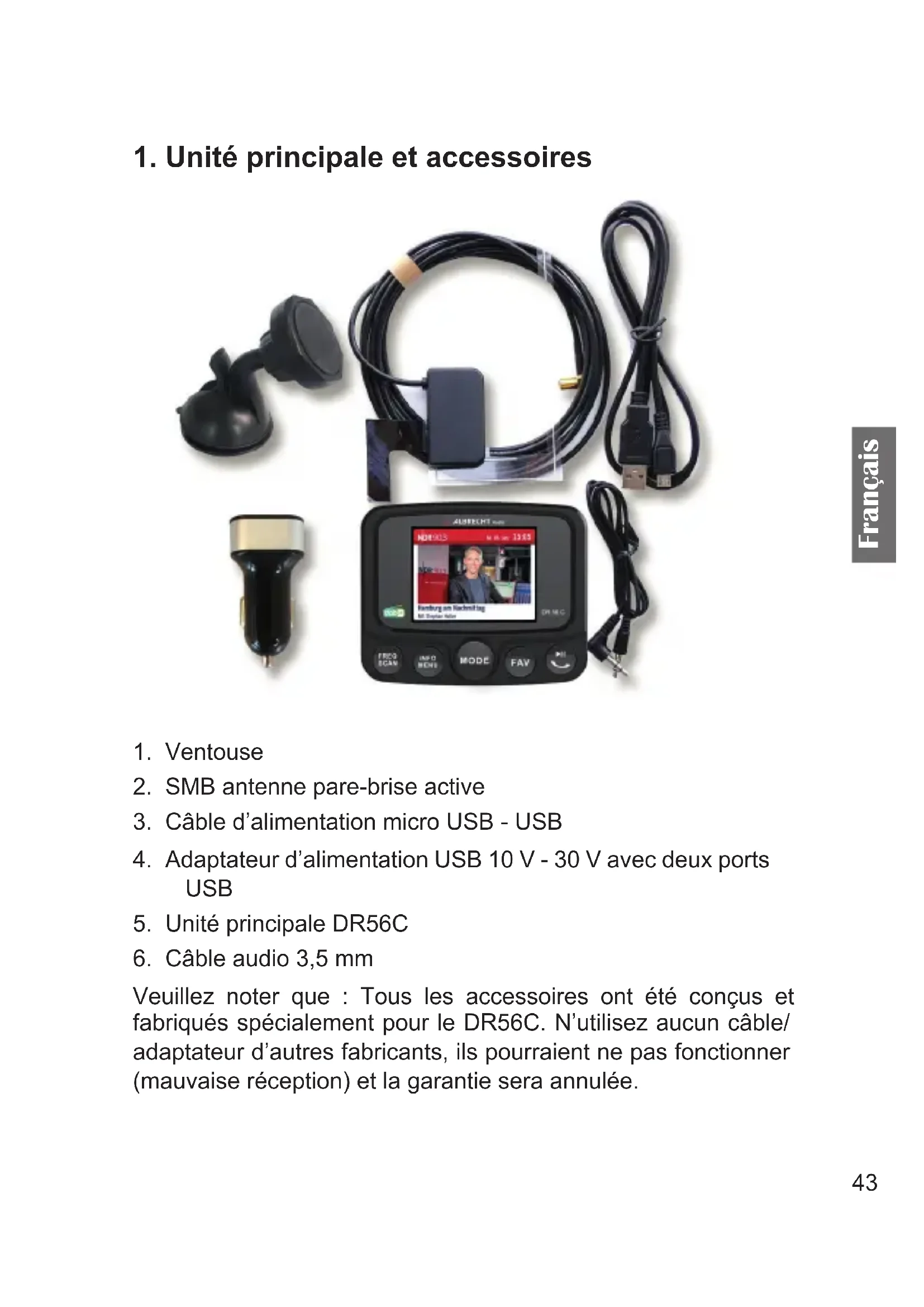 Veuillez noter que : Tous les accessoires ont été conçus et fabriqués spécialement pour le DR56C. N’utilisez aucun câble/ adaptateur d’autres fabricants, ils pourraient ne pas fonctionner (mauvaise réception) et la garantie sera annulée.44 Français