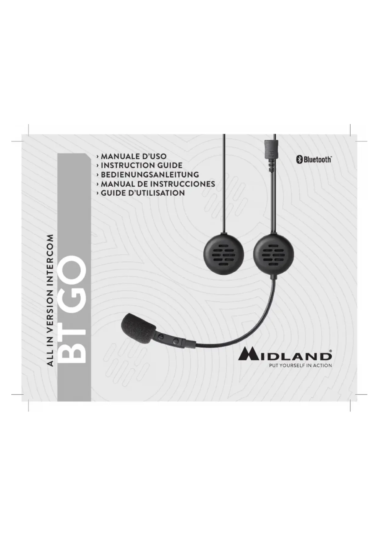 Merci d’avoir choisi le Midland BT GO Headset et Intercom pour Scooters et Motos. Avec votre BT Go vous pouvez écouter de la musique stéréo et la voix de la navigation GPS, de passer et répondre aux appels téléphoniques, ainsi que de parler avec vos amis en interphone full duplex. Caractéristique principale: > Bluetooth 3.0 qui supporte les protocoles suivant: > Casque à écouteur, Kit main libre(HFP), A2DP, AVRCP > Puissance: 2.5 mW > Intercom conducteur – passager > Intercom moto à moto jusque 200m (Dépend des conditions de terrain) > Connectez votre téléphone pour passer et répondre à des appels téléphoniques > Ecoutez votre musique stéréo (AD2P) > Connectez votre GPS pour les indications de direction > Batterie lithium avec 8h d’autonomie en conversation > Temps de recharge ~2h > Totalement Waterproof > DSP technologie anti bruit Description du BT GO Dans la boite: Unité BT GO, Câble de recharge USB, Mousse de micro de rechange, Velcro pour haut parleur. HAUT PARLEUR DROITHAUT PARLEUR GAUCHETOUCHE+MICROPHONETOUCHE -MICRO-USBF midlandeurope.com