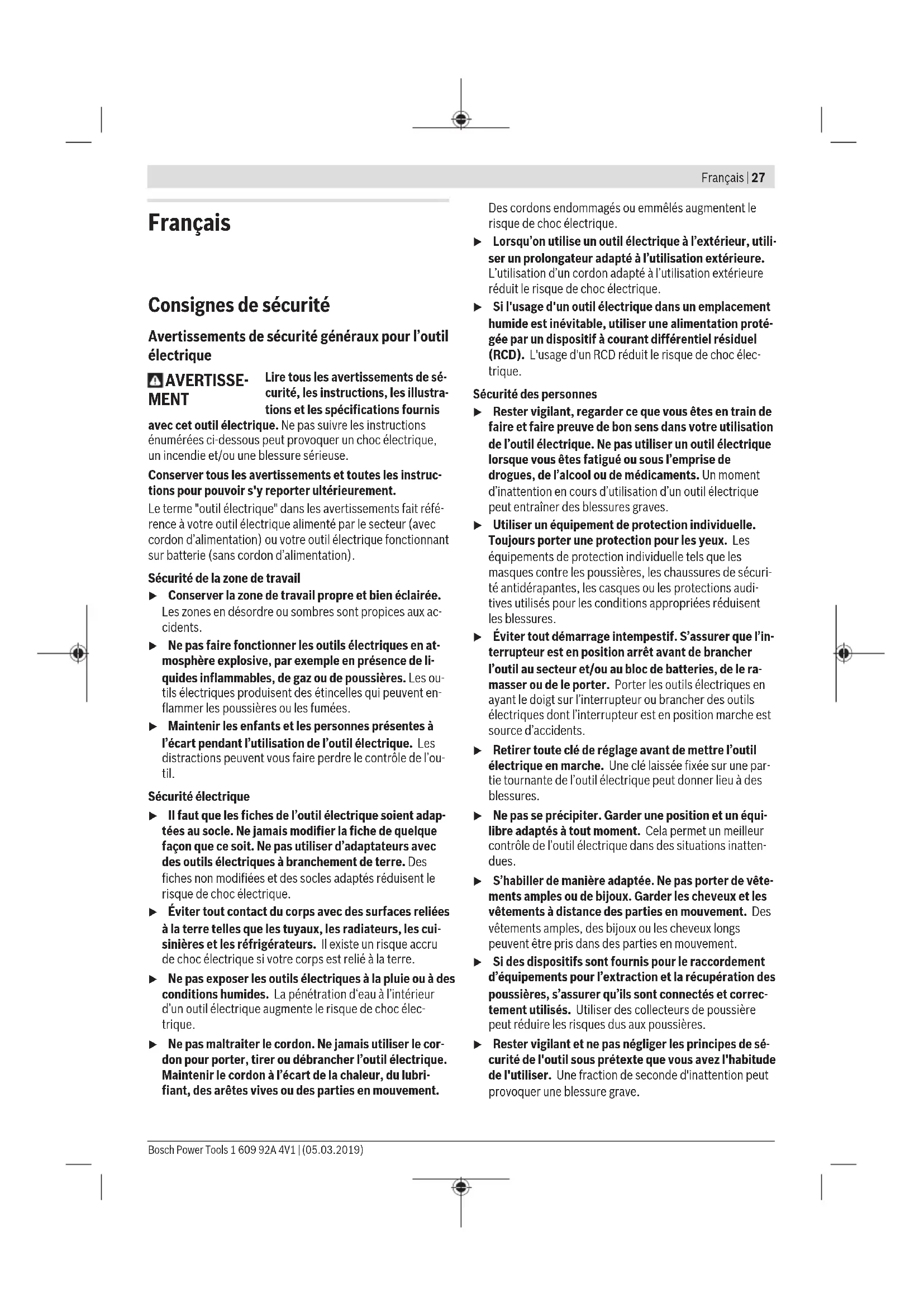 toxic heavy metal. Ni-MH: Nickel metal hydride 1 609 92A 4V1 | (05.03.2019) Bosch Power ToolsFrançais | 27 Français Consignes de sécurité Avertissements de sécurité généraux pour l’outil électrique AVERTISSE- MENT Lire tous les avertissements de sé- curité, les instructions, les illustra- tions et les spécifications fournis avec cet outil électrique. Ne pas suivre les instructions énumérées ci-dessous peut provoquer un choc électrique, un incendie et/ou une blessure sérieuse. Conserver tous les avertissements et toutes les instruc- tions pour pouvoir s'y reporter ultérieurement. Le terme "outil électrique" dans les avertissements fait réfé- rence à votre outil électrique alimenté par le secteur (avec cordon d’alimentation) ou votre outil électrique fonctionnant sur batterie (sans cordon d’alimentation). Sécurité de la zone de travail u Conserver la zone de travail propre et bien éclairée. Les zones en désordre ou sombres sont propices aux ac- cidents. u Ne pas faire fonctionner les outils électriques en at- mosphère explosive, par exemple en présence de li- quides inflammables, de gaz ou de poussières. Les ou- tils électriques produisent des étincelles qui peuvent en- flammer les poussières ou les fumées. u Maintenir les enfants et les personnes présentes à l’écart pendant l’utilisation de l’outil électrique. Les distractions peuvent vous faire perdre le contrôle de l’ou- til. Sécurité électrique u Il faut que les fiches de l’outil électrique soient adap- tées au socle. Ne jamais modifier la fiche de quelque façon que ce soit. Ne pas utiliser d’adaptateurs avec des outils électriques à branchement de terre. Des fiches non modifiées et des socles adaptés réduisent le risque de choc électrique. u Éviter tout contact du corps avec des surfaces reliées à la terre telles que les tuyaux, les radiateurs, les cui- sinières et les réfrigérateurs. Il existe un risque accru de choc électrique si votre corps est relié à la terre. u Ne pas exposer les outils électriques à la pluie ou à des conditions humides. La pénétration d‘eau à l’intérieur d’un outil électrique augmente le risque de choc élec- trique. u Ne pas maltraiter le cordon. Ne jamais utiliser le cor- don pour porter, tirer ou débrancher l’outil électrique. Maintenir le cordon à l’écart de la chaleur, du lubri- fiant, des arêtes vives ou des parties en mouvement. Des cordons endommagés ou emmêlés augmentent le risque de choc électrique. u Lorsqu’on utilise un outil électrique à l’extérieur, utili- ser un prolongateur adapté à l’utilisation extérieure. L’utilisation d’un cordon adapté à l’utilisation extérieure réduit le risque de choc électrique. u Si l'usage d'un outil électrique dans un emplacement humide est inévitable, utiliser une alimentation proté- gée par un dispositif à courant différentiel résiduel (RCD). L'usage d'un RCD réduit le risque de choc élec- trique. Sécurité des personnes u Rester vigilant, regarder ce que vous êtes en train de faire et faire preuve de bon sens dans votre utilisation de l’outil électrique. Ne pas utiliser un outil électrique lorsque vous êtes fatigué ou sous l’emprise de drogues, de l’alcool ou de médicaments. Un moment d’inattention en cours d’utilisation d’un outil électrique peut entraîner des blessures graves. u Utiliser un équipement de protection individuelle. Toujours porter une protection pour les yeux. Les équipements de protection individuelle tels que les masques contre les poussières, les chaussures de sécuri- té antidérapantes, les casques ou les protections audi- tives utilisés pour les conditions appropriées réduisent les blessures. u Éviter tout démarrage intempestif. S’assurer que l’in- terrupteur est en position arrêt avant de brancher l’outil au secteur et/ou au bloc de batteries, de le ra- masser ou de le porter. Porter les outils électriques en ayant le doigt sur l’interrupteur ou brancher des outils électriques dont l’interrupteur est en position marche est source d’accidents. u Retirer toute clé de réglage avant de mettre l’outil électrique en marche. Une clé laissée fixée sur une par- tie tournante de l’outil électrique peut donner lieu à des blessures. u Ne pas se précipiter. Garder une position et un équi- libre adaptés à tout moment. Cela permet un meilleur contrôle de l’outil électrique dans des situations inatten- dues. u S’habiller de manière adaptée. Ne pas porter de vête- ments amples ou de bijoux. Garder les cheveux et les vêtements à distance des parties en mouvement. Des vêtements amples, des bijoux ou les cheveux longs peuvent être pris dans des parties en mouvement. u Si des dispositifs sont fournis pour le raccordement d’équipements pour l’extraction et la récupération des poussières, s’assurer qu’ils sont connectés et correc- tement utilisés. Utiliser des collecteurs de poussière peut réduire les risques dus aux poussières. u Rester vigilant et ne pas négliger les principes de sé- curité de l'outil sous prétexte que vous avez l'habitude de l'utiliser. Une fraction de seconde d'inattention peut provoquer une blessure grave. Bosch Power Tools 1 609 92A 4V1 | (05.03.2019)28 | Français Utilisation et entretien de l’outil électrique u Ne pas forcer l’outil électrique. Utiliser l’outil élec- trique adapté à votre application. L’outil électrique adapté réalise mieux le travail et de manière plus sûre au régime pour lequel il a été construit. u Ne pas utiliser l’outil électrique si l’interrupteur ne permet pas de passer de l’état de marche à arrêt et in- versement. Tout outil électrique qui ne peut pas être commandé par l’interrupteur est dangereux et il faut le ré- parer. u Débrancher la fiche de la source d’alimentation et/ou enlever le bloc de batteries, s'il est amovible, avant tout réglage
