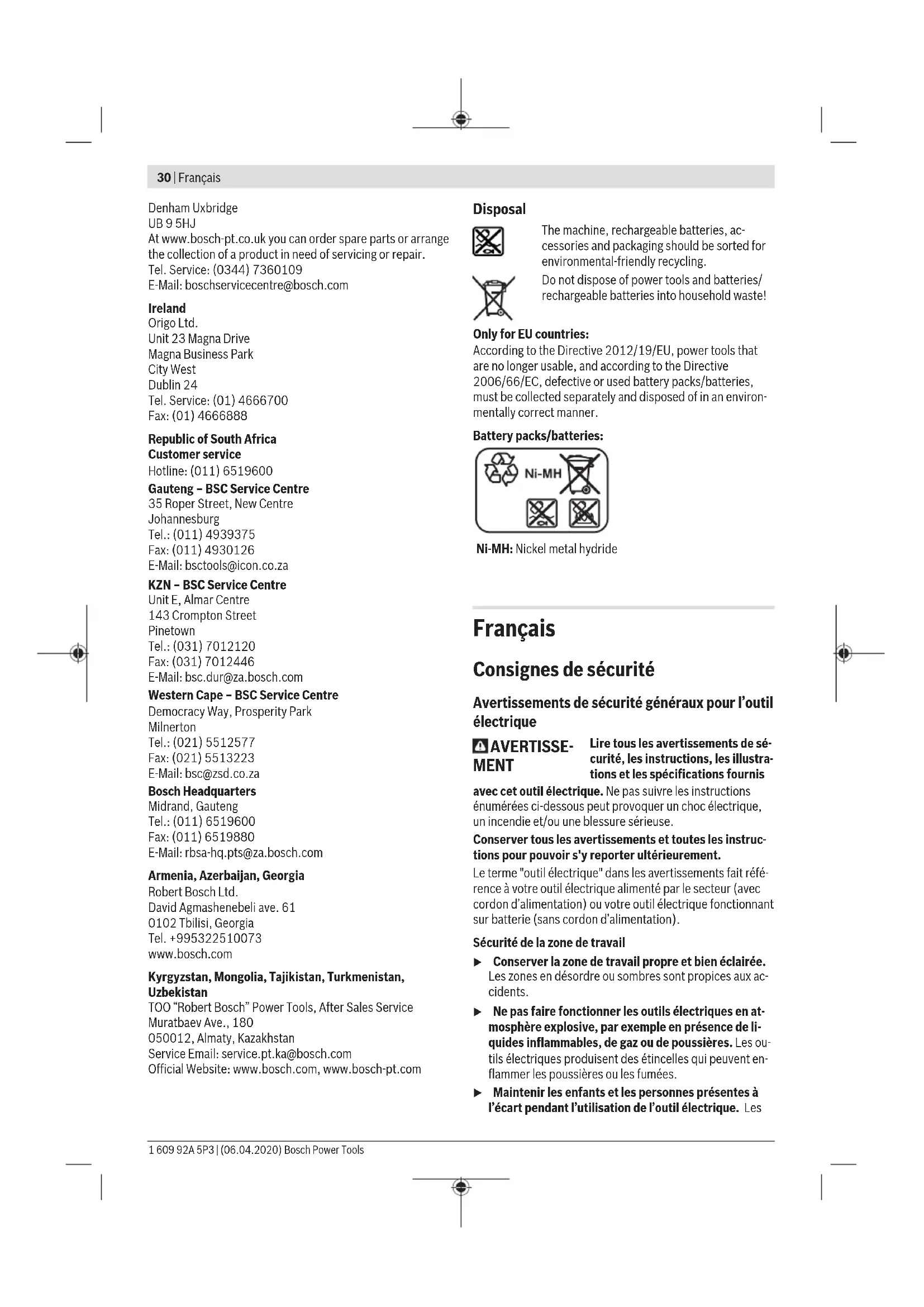 Nombre de cellules 8 10 12 Tension de l’accu V 9,6 12,0 14,4 Capacité Ah 2,6 2,6 2,6 Poids selon EPTA-Procedure 01:2014 kg 0,55 0,70 0,80 1 609 92A 5P3 | (06.04.2020) Bosch Power ToolsFrançais | 37 Accu NiMH 9,6 12,0 14,4 Chargeurs recommandés AL2450DV AL2450DV AL2450DV Renvoi d’angle ■ 1/4" ■ 3/8" ■ 3/8" 1/4" SWF 1/4" Référence