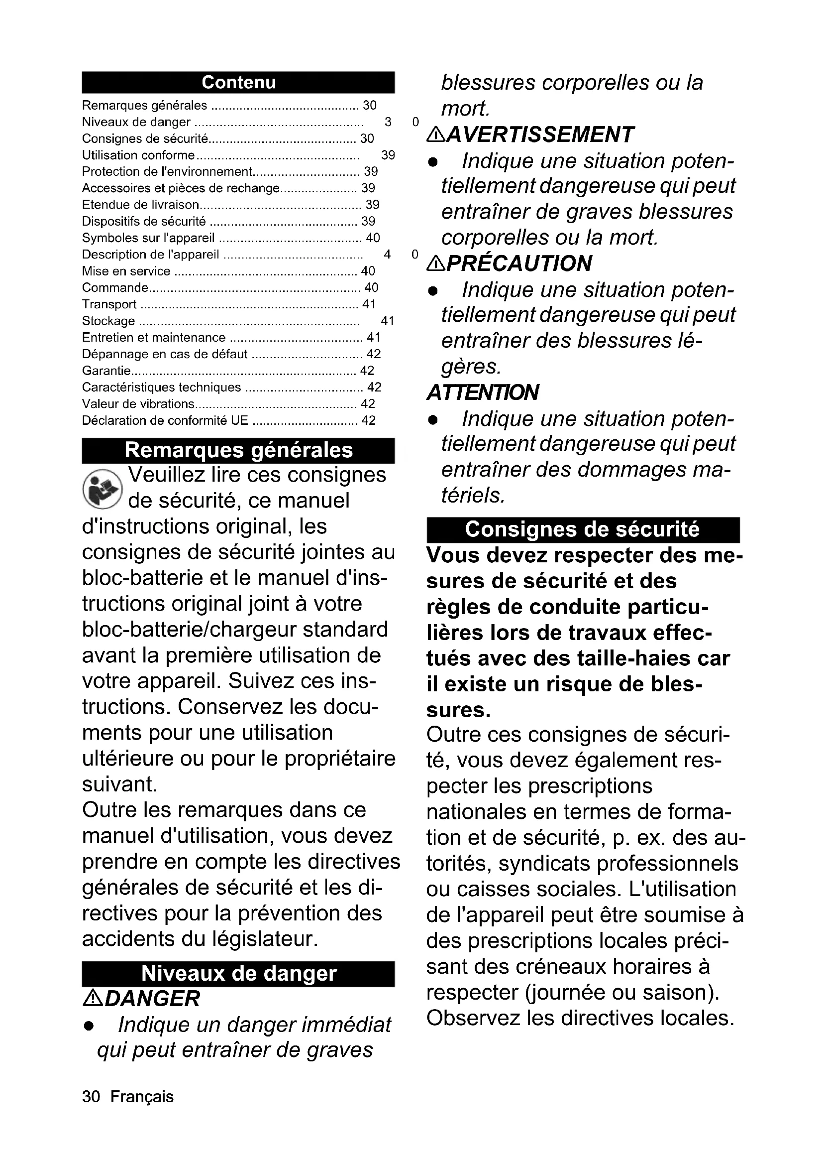 - 1,5 Dimensions and weights Cutting lenght mm 600 Weight (without battery pack) kg 3,45 Chairman of the Board of ManagementDirector Regulatory Affairs & Certification H. Jenner S. Reiser30 Français Contenu Remarques générales Veuillez lire ces consignes de sécurité, ce manuel d'instructions original, les consignes de sécurité jointes au bloc-batterie et le manuel d'ins- tructions original joint à votre bloc-batterie/chargeur standard avant la première utilisation de votre appareil. Suivez ces ins- tructions. Conservez les docu- ments pour une utilisation ultérieure ou pour le propriétaire suivant. Outre les remarques dans ce manuel d'utilisation, vous devez prendre en compte les directives générales de sécurité et les di- rectives pour la prévention des accidents du législateur. Niveaux de danger DANGER ● Indique un danger immédiat qui peut entraîner de graves blessures corporelles ou la mort. 몇 AVERTISSEMENT ● Indique une situation poten- tiellement dangereuse qui peut entraîner de graves blessures corporelles ou la mort. 몇 PRÉCAUTION ● Indique une situation poten- tiellement dangereuse qui peut entraîner des blessures lé- gères. ATTENTION ● Indique une situation poten- tiellement dangereuse qui peut entraîner des dommages ma- tériels. Consignes de sécurité Vous devez respecter des me- sures de sécurité et des règles de conduite particu- lières lors de travaux effec- tués avec des taille-haies car il existe un risque de bles- sures. Outre ces consignes de sécuri- té, vous devez également res- pecter les prescriptions nationales en termes de forma- tion et de sécurité, p. ex. des au- torités, syndicats professionnels ou caisses sociales. L'utilisation de l'appareil peut être soumise à des prescriptions locales préci- sant des créneaux horaires à respecter (journée ou saison). Observez les directives locales. Remarques générales p. 30