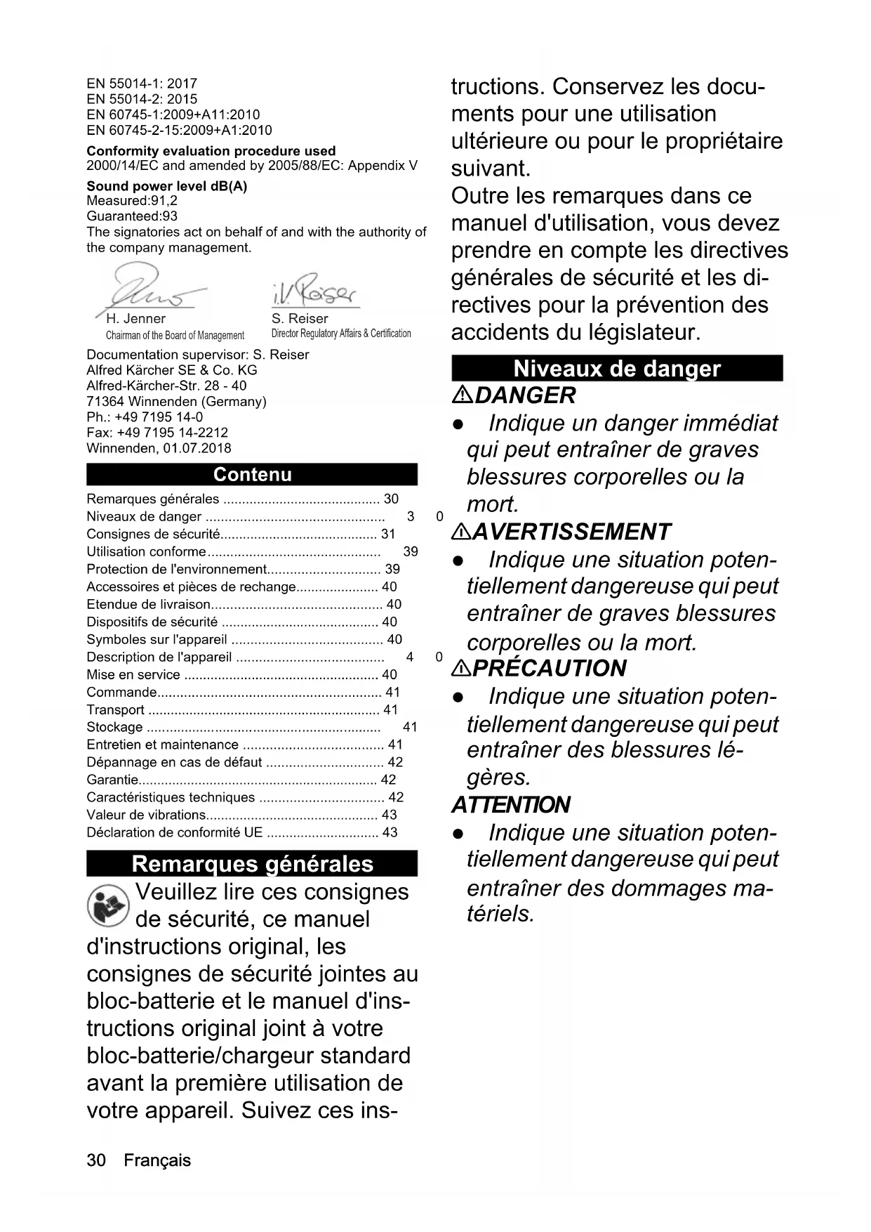 - Cutting blade length mm 500 Weight (without battery pack) kg 2,730 Français EN 55014-1: 2017 EN 55014-2: 2015 EN 60745-1:2009+A11:2010 EN 60745-2-15:2009+A1:2010 Conformity evaluation procedure used 2000/14/EC and amended by 2005/88/EC: Appendix V Sound power level dB(A) Measured:91,2 Guaranteed:93 The signatories act on behalf of and with the authority of the company management. Documentation supervisor: S. Reiser Alfred Kärcher SE & Co. KG Alfred-Kärcher-Str. 28 - 40 71364 Winnenden (Germany) Ph.: +49 7195 14-0 Fax: +49 7195 14-2212 Winnenden, 01.07.2018 Contenu Remarques générales Veuillez lire ces consignes de sécurité, ce manuel d'instructions original, les consignes de sécurité jointes au bloc-batterie et le manuel d'ins- tructions original joint à votre bloc-batterie/chargeur standard avant la première utilisation de votre appareil. Suivez ces ins- tructions. Conservez les docu- ments pour une utilisation ultérieure ou pour le propriétaire suivant. Outre les remarques dans ce manuel d'utilisation, vous devez prendre en compte les directives générales de sécurité et les di- rectives pour la prévention des accidents du législateur. Niveaux de danger DANGER ● Indique un danger immédiat qui peut entraîner de graves blessures corporelles ou la mort. 몇 AVERTISSEMENT ● Indique une situation poten- tiellement dangereuse qui peut entraîner de graves blessures corporelles ou la mort. 몇 PRÉCAUTION ● Indique une situation poten- tiellement dangereuse qui peut entraîner des blessures lé- gères. ATTENTION ● Indique une situation poten- tiellement dangereuse qui peut entraîner des dommages ma- tériels. Remarques générales p. 30