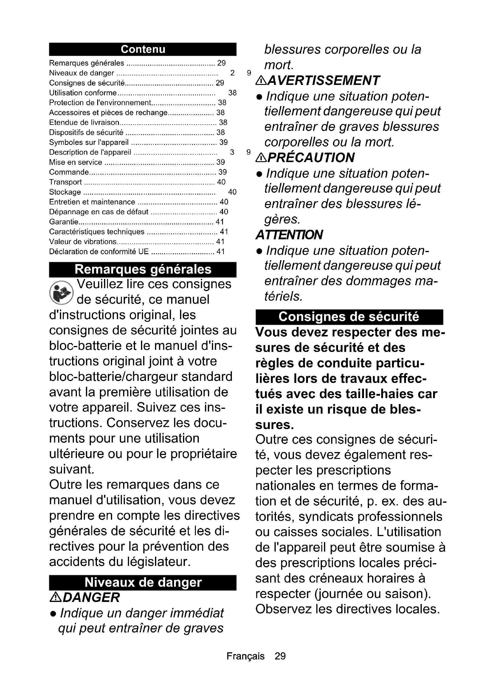 - Cutting blade length mm 450 Weight (without battery pack) kg 2,55 Chairman of the Board of ManagementDirector Regulatory Affairs & Certification H. Jenner S. ReiserFrançais 29 Contenu Remarques générales Veuillez lire ces consignes de sécurité, ce manuel d'instructions original, les consignes de sécurité jointes au bloc-batterie et le manuel d'ins- tructions original joint à votre bloc-batterie/chargeur standard avant la première utilisation de votre appareil. Suivez ces ins- tructions. Conservez les docu- ments pour une utilisation ultérieure ou pour le propriétaire suivant. Outre les remarques dans ce manuel d'utilisation, vous devez prendre en compte les directives générales de sécurité et les di- rectives pour la prévention des accidents du législateur. Niveaux de danger DANGER ● Indique un danger immédiat qui peut entraîner de graves blessures corporelles ou la mort. 몇 AVERTISSEMENT ● Indique une situation poten- tiellement dangereuse qui peut entraîner de graves blessures corporelles ou la mort. 몇 PRÉCAUTION ● Indique une situation poten- tiellement dangereuse qui peut entraîner des blessures lé- gères. ATTENTION ● Indique une situation poten- tiellement dangereuse qui peut entraîner des dommages ma- tériels. Consignes de sécurité Vous devez respecter des me- sures de sécurité et des règles de conduite particu- lières lors de travaux effec- tués avec des taille-haies car il existe un risque de bles- sures. Outre ces consignes de sécuri- té, vous devez également res- pecter les prescriptions nationales en termes de forma- tion et de sécurité, p. ex. des au- torités, syndicats professionnels ou caisses sociales. L'utilisation de l'appareil peut être soumise à des prescriptions locales préci- sant des créneaux horaires à respecter (journée ou saison). Observez les directives locales. Remarques générales p. 29