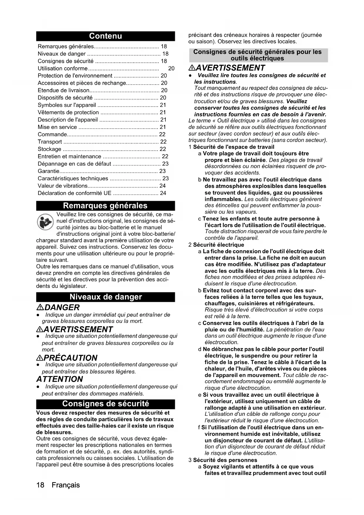 - Cutting length mm 638 Weight (without battery pack) kg 4,5 EU Declaration of Conformity HT 650/ 36 Bp Declaration of Conformity (UK)18 Français Contenu Remarques générales Veuillez lire ces consignes de sécurité, ce ma- nuel d'instructions original, les consignes de sé- curité jointes au bloc-batterie et le manuel d'instructions original joint à votre bloc-batterie/ chargeur standard avant la première utilisation de votre appareil. Suivez ces instructions. Conservez les docu- ments pour une utilisation ultérieure ou pour le proprié- taire suivant. Outre les remarques dans ce manuel d'utilisation, vous devez prendre en compte les directives générales de sécurité et les directives pour la prévention des acci- dents du législateur. Niveaux de danger DANGER ● Indique un danger immédiat qui peut entraîner de graves blessures corporelles ou la mort. 몇 AVERTISSEMENT ● Indique une situation potentiellement dangereuse qui peut entraîner de graves blessures corporelles ou la mort. 몇 PRÉCAUTION ● Indique une situation potentiellement dangereuse qui peut entraîner des blessures légères. ATTENTION ● Indique une situation potentiellement dangereuse qui peut entraîner des dommages matériels. Consignes de sécurité Vous devez respecter des mesures de sécurité et des règles de conduite particulières lors de travaux effectués avec des taille-haies car il existe un risque de blessures. Outre ces consignes de sécurité, vous devez égale- ment respecter les prescriptions nationales en termes de formation et de sécurité, p. ex. des autorités, syndi- cats professionnels ou caisses sociales. L'utilisation de l'appareil peut être soumise à des prescriptions locales précisant des créneaux horaires à respecter (journée ou saison). Observez les directives locales. Consignes de sécurité générales pour les outils électriques 몇 AVERTISSEMENT ● Veuillez lire toutes les consignes de sécurité et les instructions. Tout manquement au respect des consignes de sécu- rité et des instructions risque de provoquer une élec- trocution et/ou de graves blessures. Veuillez conserver toutes les consignes de sécurité et les instructions fournies en cas de besoin à l'avenir. Le terme « Outil électrique » utilisé dans les consignes de sécurité se réfère aux outils électriques fonctionnant sur secteur (avec cordon secteur) et aux outils élec- triques fonctionnant sur batteries (sans cordon secteur). 1 Sécurité de l'espace de travail a Votre plage de travail doit toujours être propre et bien éclairée. Des plages de travail désordonnées ou non éclairées risquent de pro- voquer des accidents. b Ne travaillez pas avec l'outil électrique dans des atmosphères explosibles dans lesquelles se trouvent des liquides, gaz ou poussières inflammables. Les outils électriques génèrent des étincelles qui peuvent enflammer la pous- sière ou les vapeurs. c Tenez les enfants et toute autre personne à l'écart lors de l'utilisation de l'outil électrique. Toute distraction risquerait de vous faire perdre le contrôle de l'appareil. 2 Sécurité électrique a La fiche de connexion de l'outil électrique doit entrer dans la prise. La fiche ne doit en aucun cas être modifiée. N'utilisez pas d'adaptateur avec les outils électriques mis à la terre. Des fiches non modifiées et des prises adaptées ré- duisent le risque d'une électrocution. b Evitez tout contact corporel avec des sur- faces reliées à la terre telles que les tuyaux, chauffages, cuisinières et réfrigérateurs. Risque très élevé d'électrocution si votre corps est relié à la terre. c Conservez les outils électriques à l'abri de la pluie ou de l'humidité. La pénétration de l'eau dans un outil électrique augmente le risque d'une électrocution. d Ne débranchez pas le câble pour porter l'outil électrique, le suspendre ou pour retirer la fiche de la prise. Tenez le câble à l'écart de la chaleur, de l'huile, d'arêtes vives ou de pièces de l'appareil en mouvement. Tout câble de rac- cordement endommagé ou emmêlé augmente le risque d'une électrocution. e Si vous travaillez avec un outil électrique à l'extérieur, utilisez uniquement un câble de rallonge adapté à une utilisation en extérieur. L'utilisation d'un câble de rallonge conçu pour l'extérieur réduit le risque d'une électrocution. f Si l'utilisation de l'outil électrique dans un en- vironnement humide est inévitable, utilisez un disjoncteur de courant de défaut. L'utilisa- tion d'un disjoncteur de courant de défaut réduit le risque d'une électrocution. 3 Sécurité des personnes a Soyez vigilants et attentifs à ce que vous faites et travaillez prudemment avec tout outil Remarques générales p. 18