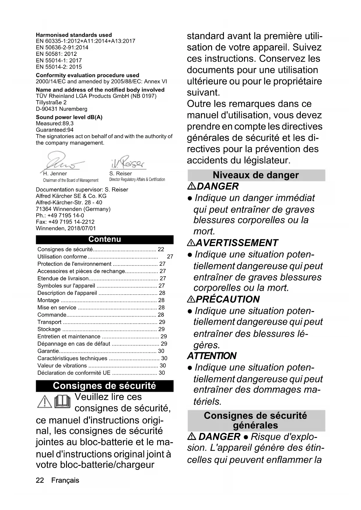 - 2,1 Uncertainty K dB(A) 1,5 Dimensions and weights Length x width x height mm 1773 x 366 x 277 Weight (without battery pack) kg 4,022 Français Harmonised standards used EN 60335-1:2012+A11:2014+A13:2017 EN 50636-2-91:2014 EN 50581: 2012 EN 55014-1: 2017 EN 55014-2: 2015 Conformity evaluation procedure used 2000/14/EC and amended by 2005/88/EC: Annex VI Name and address of the notified body involved TÜV Rheinland LGA Products GmbH (NB 0197) Tillystraße 2 D-90431 Nuremberg Sound power level dB(A) Measured:89,3 Guaranteed:94 The signatories act on behalf of and with the authority of the company management. Documentation supervisor: S. Reiser Alfred Kärcher SE & Co. KG Alfred-Kärcher-Str. 28 - 40 71364 Winnenden (Germany) Ph.: +49 7195 14-0 Fax: +49 7195 14-2212 Winnenden, 2018/07/01 Contenu Consignes de sécurité Veuillez lire ces consignes de sécurité, ce manuel d'instructions origi- nal, les consignes de sécurité jointes au bloc-batterie et le ma- nuel d'instructions original joint à votre bloc-batterie/chargeur standard avant la première utili- sation de votre appareil. Suivez ces instructions. Conservez les documents pour une utilisation ultérieure ou pour le propriétaire suivant. Outre les remarques dans ce manuel d'utilisation, vous devez prendre en compte les directives générales de sécurité et les di- rectives pour la prévention des accidents du législateur. Niveaux de danger DANGER ● Indique un danger immédiat qui peut entraîner de graves blessures corporelles ou la mort. 몇 AVERTISSEMENT ● Indique une situation poten- tiellement dangereuse qui peut entraîner de graves blessures corporelles ou la mort. 몇 PRÉCAUTION ● Indique une situation poten- tiellement dangereuse qui peut entraîner des blessures lé- gères. ATTENTION ● Indique une situation poten- tiellement dangereuse qui peut entraîner des dommages ma- tériels. Consignes de sécurité générales DANGER ● Risque d'explo- sion. L'appareil génère des étin- celles qui peuvent enflammer la Consignes de sécurité p. 22