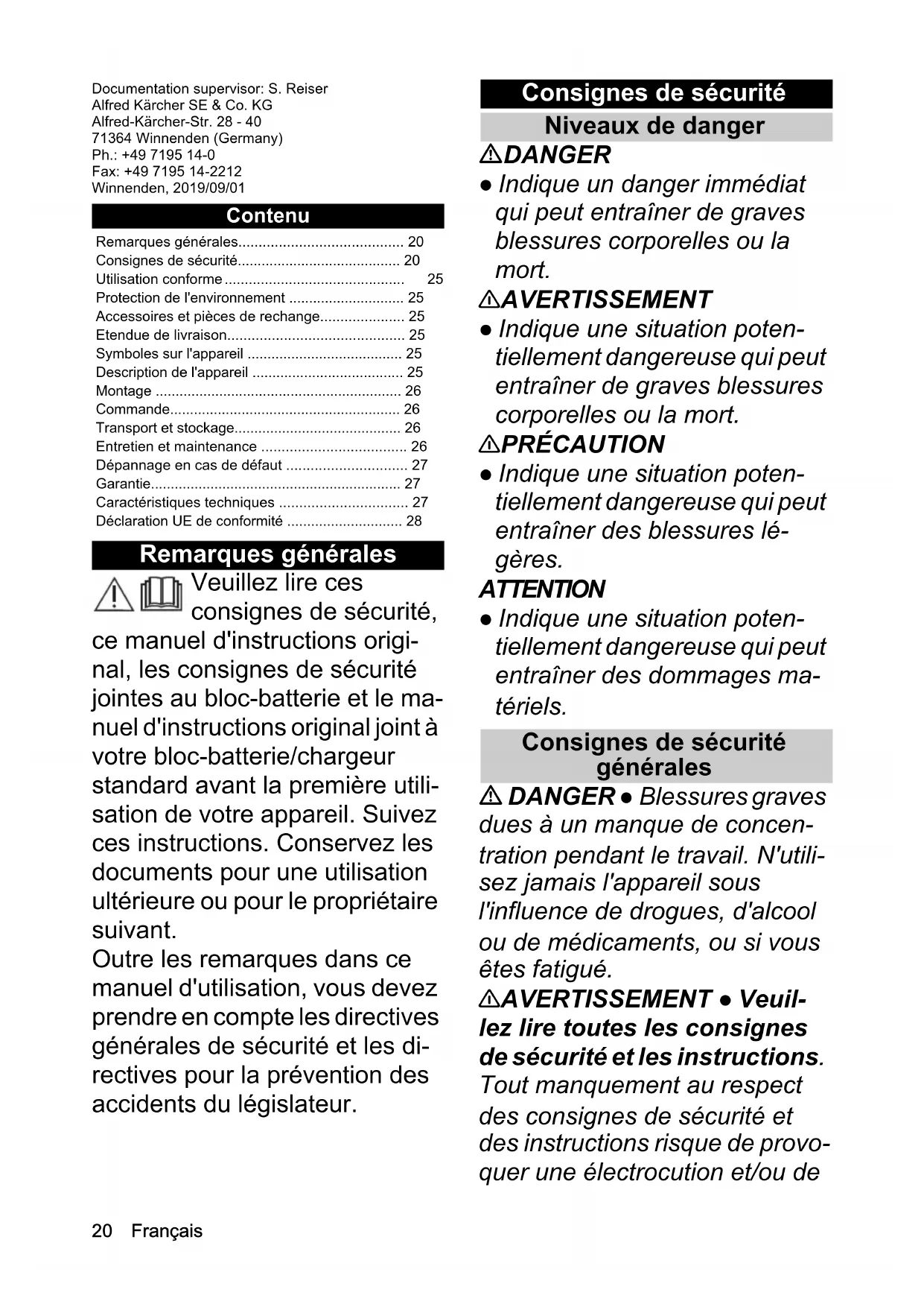 - 1,5 Chairman of the Board of ManagementDirector Regulatory Affairs & CertificationH. JennerS. Reiser20 Français Documentation supervisor: S. Reiser Alfred Kärcher SE & Co. KG Alfred-Kärcher-Str. 28 - 40 71364 Winnenden (Germany) Ph.: +49 7195 14-0 Fax: +49 7195 14-2212 Winnenden, 2019/09/01 Contenu Remarques générales Veuillez lire ces consignes de sécurité, ce manuel d'instructions origi- nal, les consignes de sécurité jointes au bloc-batterie et le ma- nuel d'instructions original joint à votre bloc-batterie/chargeur standard avant la première utili- sation de votre appareil. Suivez ces instructions. Conservez les documents pour une utilisation ultérieure ou pour le propriétaire suivant. Outre les remarques dans ce manuel d'utilisation, vous devez prendre en compte les directives générales de sécurité et les di- rectives pour la prévention des accidents du législateur. Consignes de sécurité Niveaux de danger DANGER ● Indique un danger immédiat qui peut entraîner de graves blessures corporelles ou la mort. 몇 AVERTISSEMENT ● Indique une situation poten- tiellement dangereuse qui peut entraîner de graves blessures corporelles ou la mort. 몇 PRÉCAUTION ● Indique une situation poten- tiellement dangereuse qui peut entraîner des blessures lé- gères. ATTENTION ● Indique une situation poten- tiellement dangereuse qui peut entraîner des dommages ma- tériels. Consignes de sécurité générales DANGER ● Blessures graves dues à un manque de concen- tration pendant le travail. N'utili- sez jamais l'appareil sous l'influence de drogues, d'alcool ou de médicaments, ou si vous êtes fatigué. 몇 AVERTISSEMENT ● Veuil- lez lire toutes les consignes de sécurité et les instructions. Tout manquement au respect des consignes de sécurité et des instructions risque de provo- quer une électrocution et/ou de Remarques générales p. 20
