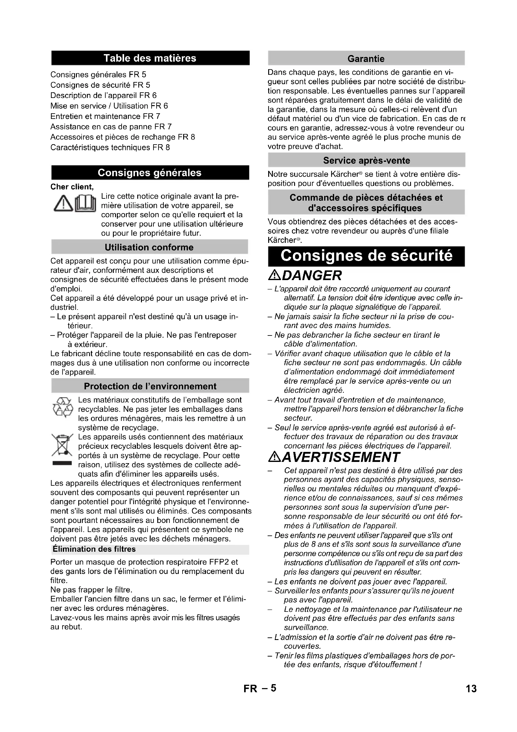 concer nant les pièces électriques de l'appareil. AVERTISSEMENT – Cet appareil n'est pas destiné à être utilisé par des personnes ayant des capacités physiques, senso- rielles ou mentales réduites ou manquant d'expé- rience et/ou de connaissances, sauf si ces mêmes personnes sont sous la supervision d'une per- sonne responsable de leur sécurité ou ont été for- mées à l'utilisation de l'appareil. – Des enfants ne peuvent utiliser l'appareil que s'ils ont plus de 8 ans et s'ils sont sous la surveillance d'une personne compétence ou s'ils ont reçu de sa part des instructions d'utilisation de l'appareil et s'ils ont com- pris les dangers qui peuvent en résulter. – Les enfants ne doivent pas jouer avec l'appareil. – Surveiller les enfants pour s'assurer qu'ils ne jouent pas avec l'appareil. – Le nettoyage et la maintenance par l'utilisateur ne doivent pas être effectués par des enfants sans surveillance. – L'admission et la sortie d'air ne doivent pas être re- couvertes. – Tenir les films plastiques d'emballages hors de por- tée des enfants, risque d'étouffement ! Table des matières Consignes générales FR 5 Consignes de sécurité FR 5 Description de l’appareil FR 6 Mise en service / Utilisation FR 6 Entretien et maintenance FR 7 Assistance en cas de panne FR 7 Accessoires et pièces de rechange FR 8 Caractéristiques techniques FR 8 Consignes générales Utilisation conforme Protection de l’environnement Élimination des filtres Garantie Service après-vente Commande de pièces détachées et d'accessoires spécifiques Consignes de sécurité 13FR– 6 – Mettre l'appareil hors service après chaque utilisa- tion et avant chaque nettoyage/entretien. – Il est interdit d’utiliser l’appareil dans des zones présentant des risques d’explosion. – Ne pas disposer l'appareil à proximité d'une source de chaleur. PRÉCAUTION – Cet appareil ne remplace pas une ventilation ap- propriée. – Installer l'appareil sur une base plane et de ma- nière stable et l'orienter. – Utiliser uniquement des pièces de rechange de la marque KÄRCHER. – Ne pas utiliser l'appareil dans un environnement humide ou dans des pièces à température environ- nante élevée, par ex. salle de bain, cuisine. DANGER Signale la présence d'un danger imminent entraînant de graves blessures corporelles et pouvant avoir une issue mortelle. 몇 AVERTISSEMENT Signale la présence d'une situation éventuellement dangereuse pouvant entraîner de graves blessures cor- porelles et même avoir une issue mortelle. 몇 PRÉCAUTION Remarque relative à une situation potentiellement dan- gereuse pouvant entraîner des blessures légères. ATTENTION Remarque relative à une situation éventuellement dan- gereuse pouvant entraîner des dommages matériels. Contrôler le matériel lors du déballage pour constater des accessoires manquants ou des dommages. Si des dégâts dus au transport sont constatés, il faut en infor- mer le revendeur. Illustrations, cf. côté escamotable ! 1 Cache du filtre avant 2 Préfiltre 3 filtre principal 4 Cache du filtre arrière 5 Sortie d'air 6 Affichage numérique 7 Pupitre de commande 8 Affichage de la qualité de l'air 9 Poignées des caches du filtre 10 Cache du capteur de qualité de l'air 11 Raccordement au secteur 12 Touche de commande Marche/Arrêt 13 Touche de commande Mode Manuel 14 Touche de commande Mode Automatique 15 Touche de commande Mode Nocturne 16 Témoin de remplacement du filtre ATTENTION Toujours exploiter l'appareil avec un pré-filtre et un filtre fin installé. Illustration Avant la première mise en service, les filtres fins déjà installés dans l’appareil doivent être déballés. Brancher le câble de raccordement à l'appareil Insérer la fiche dans la prise du réseau. Toutes les touches de commande du champ de commande et le voyant de la qualité de l'air s'al- lume succinctement et s'éteignent à nouveau. Actionner la touche de commande Marche/Arrêt pour allumer l'appareil. Remarque – Si l'appareil est allumé, le capteur intégré de quali- té de l'air mesure automatiquement la qualité de l'air de la pièce. – Régler le mode souhaité en appuyant sur la touche de commande respective sur le champ de com- mande. Si le mode automatique est activé, l'appareil sélec- tionne la vitesse de soufflerie appropriée pour la qualité de l'air mesurée. Actionner la touche de commande Marche/Arrêt pour allumer l'appareil. Actionner la touche de commande Mode Automa- tique. La touche correspondante s'allume. Remarque – Le capteur intégré de qualité de l'air mesure la qua- lité de l'air et sélectionne automatiquement le bon niveau de vitesse pour assurer la meilleure qualité de l'air possible dans la pièce. – Dès que l'air est propre, l'appareil commute sur la vitesse de l'air la plus faible. Lorsque le mode manuel est activé, vous pouvez régler la vitesse de l'air manuellement. Actionner la touche de commande Marche/Arrêt pour allumer l'appareil. Actionner la touche de commande Mode Manuel. La touche correspondante s'allume. Remarque – En actionnant à plusieurs reprises, la vitesse du ventilateur peut être réglée sur 3 niveaux. Niveaux de danger Description de l’appareil Mise en service / Utilisation Première mise en service Mise en service Zone de commande Mode Automatique Mode Manuel Affichage Vitesse du ventilateur une pâle du ventilateur faible deux pâles du ventila- teur moyen trois pâles du ventila- teur élevé 14 FR– 7 Lorsque le mode nuit est activé, les éléments du tableau de commande et d’affichage sont éteints. L’appareil reste en fonctionnement et la vitesse du ven- tilateur passe au niveau le plus bas. En touchant le tableau de commande, l'éclairage de l’appareil s'active à nouveau. Actionner la touche de commande Marche/Arrêt pour allumer l'appareil. Actionner la touche de commande mode nocturne. La touche correspondante s'allume. Les éléments du tableau 