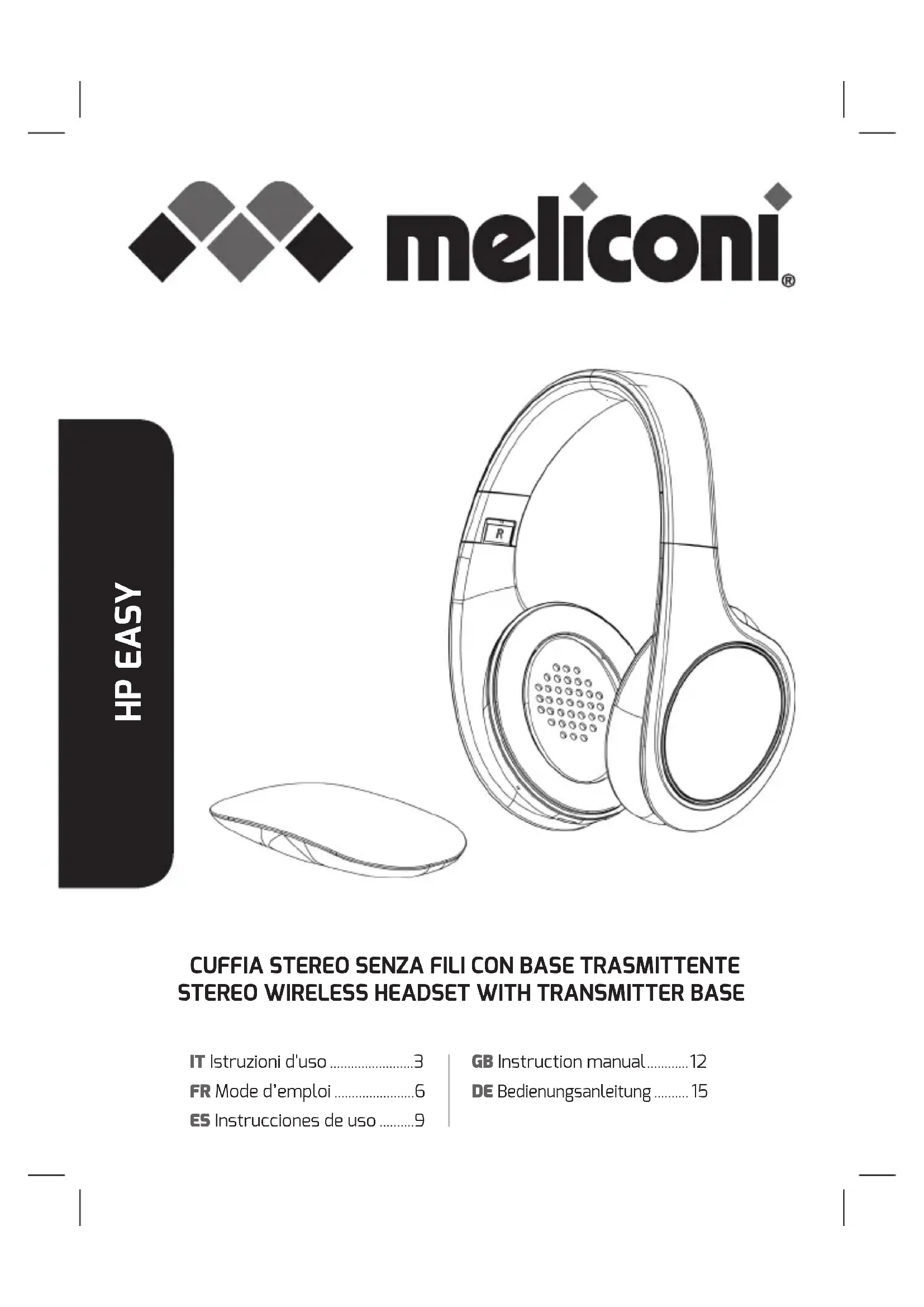 - consultate il nostro sito Internet www.meliconi.com Per ogni evenienza potete chiamare la nostra ASSISTENZA TECNICA clienti, al numero (+39) 02 66012766 oppure scrivere una mail all’indirizzo: info@meliconi.com Dichiarazione di conformità UE semplicata Il fabbricante, Meliconi S.p.A., dichiara che il tipo di apparecchiatura radio, Cua HP Easy è conforme alla Direttiva 2014/53/EU (RED). Il testo completo della Dichiarazione di Conformità UE è disponibile al seguente indirizzo Internet: http://www.meliconi.com/doc/hpeasy6 HP EASY Merci d'avoir choisi un produit MELICONI Le système de casque stéréo RF sans l HP Easy Meliconi utilise une technologie de pointe de réception audio sans l et permet de restituer un son stéréo de haute qualité provenant d’appareils audio diérents TV, décodeur, lecteur DVD et Blu-ray, lecteur CD, chaîne HiFi, radio, ordinateur, etc.), en orant une liberté de mouvement maximale. L’émetteur accepte UNIQUEMENT les signaux audio analogiques en entrée. Vérier que l'équipement à connecter possède une sortie audio casque traditionnelle (jack 3,5 mm). Si ce n'est pas le cas, utiliser un adaptateur spécique (non fourni). Le signal de l'émetteur, capable de traverser des murs, a une portée maximale de 100 mètres en champ libre. Le casque peut être utilisé en mode « passif », c'est-à-dire connecté directement à la sortie casque de l'appareil via un câble jack 3,5 mm.