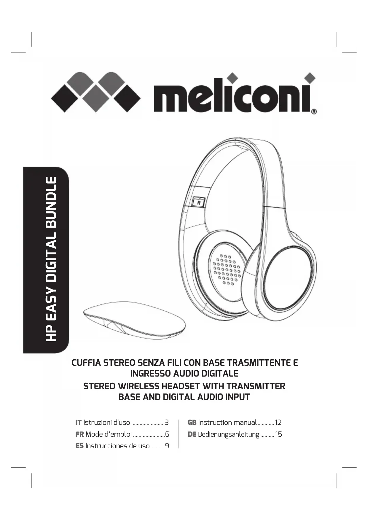 Merci d'avoir choisi un produit MELICONI Le système de casque stéréo RF sans l HP Easy Meliconi utilise une technologie de pointe de réception audio sans l et permet de restituer un son stéréo de haute qualité provenant d’appareils audio différents (TV, décodeur, lecteur DVD et Blu-ray, lecteur CD, chaîne HiFi, radio, ordinateur, etc.), en offrant une liberté de mouvement maximale. L'émetteur peut être connecté tant aux sources audio avec sortie numérique optique (Toslink), qu’aux appareils analogiques via la sortie casque audio traditionnelle (jack 3,5 mm). Le signal de l'émetteur, capable de traverser des murs, a une portée maximale de 100 mètres en champ libre.