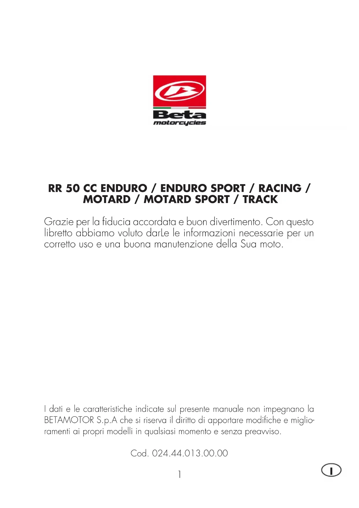 Merci de votre confiance et bon divertissement. Ce livret vous donnera les informations nécessaires pour une utilisation correcte et un bon entretien de votre moto. Les informations et les caractéristiques indiquées dans ce manuel n’engagent pas BETAMOTOR S.p.A. qui se réserve le droit d’apporter des modifications et des améliorations à ses modèles à tout moment et sans préavis. Code 024.44.013.00.002