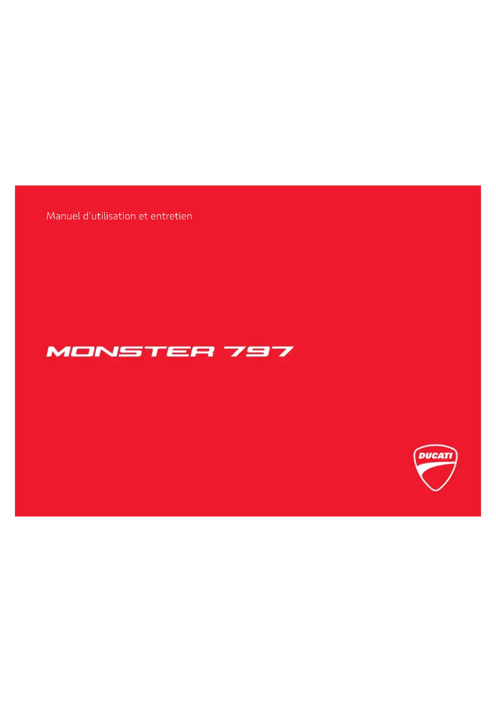 Manuel d'utilisation et entretienManuel d'utilisation et entretien FRANÇAIS 1Cher Ducatiste, nous vous remercions de nous avoir fait confiance pour l'achat de votre nouveau Monster 797. Nous vous recommandons de lire votre manuel d’utilisation et d'entretien, afin de vous familiariser rapidement avec votre Ducati et de tirer profit de toutes ses caractéristiques ; à l'intérieur du manuel, nous vous fournissons de nombreux conseils et informations utiles sur votre sécurité, sur les soins à apporter à votre moto et sur la façon de préserver la valeur de votre véhicule grâce à un entretien correct auprès des Services spécialisés. Vous pouvez également trouver ce manuel d'utilisation en format numérique, toujours actualisé, dans la zone dédiée du site web Ducati et dans l'application MyDucati, qui peut être consultée à la fois depuis un PC et un téléphone.