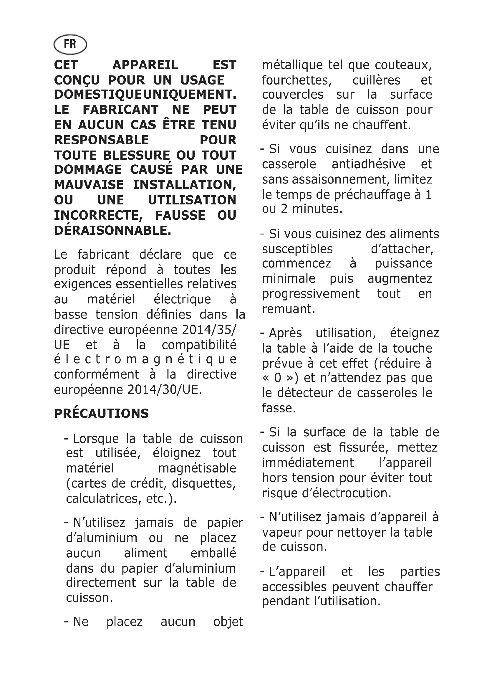 DÉRAISONNABLE. Le fabricant déclare que ce produit répond à toutes les exigences essentielles relatives au matériel électrique à basse tension dénies dans la directive européenne 2014/35/ UE et à la compatibilité électromagnétique conformément à la directive européenne 2014/30/UE. PRÉCAUTIONS - Lorsque la table de cuisson est utilisée, éloignez tout matériel magnétisable (cartes de crédit, disquettes, calculatrices, etc.). - N’utilisez jamais de papier d’aluminium ou ne placez aucun aliment emballé dans du papier d’aluminium directement sur la table de cuisson. - Ne placez aucun objet métallique tel que couteaux, fourchettes, cuillères et couvercles sur la surface de la table de cuisson pour éviter qu’ils ne chauffent. - Si vous cuisinez dans une casserole antiadhésive et sans assaisonnement, limitez le temps de préchauffage à 1 ou 2 minutes. - Si vous cuisinez des aliments susceptibles d’attacher, commencez à puissance minimale puis augmentez progressivement tout en remuant. - Après utilisation, éteignez la table à l’aide de la touche prévue à cet effet (réduire à « 0 ») et n’attendez pas que le détecteur de casseroles le fasse. - Si la surface de la table de cuisson est ssurée, mettez immédiatement l’appareil hors tension pour éviter tout risque d’électrocution. - N’utilisez jamais d’appareil à vapeur pour nettoyer la table de cuisson. - L’appareil et les parties accessibles peuvent chauffer pendant l’utilisation. FR- Veillez à ne pas toucher les éléments chauffants. - Les enfants de moins de 8 ans doivent être maintenus à l’écart, sauf s’ils sont surveillés en permanence. - Cet appareil peut être utilisé par les enfants à partir de 8 ans et les personnes aux capacités physiques, sensorielles ou mentales réduites, ou manquant d’expérience et de connaissances, uniquement sous surveillance ou après avoir reçu des instructions concernant l’utilisation de l’appareil en toute sécurité et après avoir compris les dangers encourus. Les enfants ne doivent pas jouer avec l’appareil. L’entretien et le nettoyage à la charge de l’utilisateur ne doivent pas être effectués par des enfants, sauf sous surveillance constante. - La cuisson avec de la graisse ou de l’huile peut être dangereuse et provoquer un incendie si elle n’est pas surveillée. N’essayez JAMAIS d’éteindre un feu avec de l’eau. Mettez plutôt l’appareil hors tension, puis couvrez les ammes avec un couvercle ou une planche, par exemple. - Le processus de cuisson doit être effectué sous surveillance. Les processus de cuisson courts doivent être surveillés en permanence. - Cuisiner sans surveillance sur une table de cuisson avec de la graisse ou de l’huile peut être dangereux et provoquer un incendie. - Risque d’incendie : ne stockez aucun élément sur les surfaces de cuisson. - Seuls les protecteurs de plans de travail conçus pour une utilisation avec l’appareil de cuisson et indiqués par le fabricant dans les consignes d’utilisation doivent être utilisés pour protéger le plan de travail intégré à l’appareil. L’utilisation de protecteurs inadaptés peut provoquer des accidents. - Ne placez pas ou ne laissez pas tomber d’objets lourds sur votre table de cuisson. - N’utilisez pas d’ustensiles de cuisine aux bords dentelés. Ne faites pas glisser les ustensiles de cuisine sur la surface du verre à induction, car vous pourriez rayer le verre.- Les personnes portant un pacemaker ou d’autres implants électriques (tels que des pompes à insuline) doivent consulter leur médecin ou leur fabricant d’implants avant d’utiliser cet appareil an de s’assurer que leurs implants ne seront pas affectés par le champ électromagnétique. - AVERTISSEMENT : Les parties accessibles chaufferont pendant l’utilisation. Pour éviter de se brûler et de s’ébouillanter, les enfants doivent être tenus à l’écart. - Installer dans le câblage xe un dispositif de mise hors tension avec une séparation de contact sur tous les pôles qui permette une déconnexion totale dans des conditions de surtension de catégorie III, conformément aux normes de câblage. La prise ou l’interrupteur omnipolaire doit être facilement accessible après l’installation de l’équipement. - Cet appareil n’est pas prévu pour fonctionner à l’aide d’un temporisateur externe ou d’un système de commande à distance. - Les fabricants déclinent toute responsabilité au cas où les normes décrites ci-dessus et celles contre les accidents ne seraient pas observées. Quelques mots sur la cuisson par induction (F1)