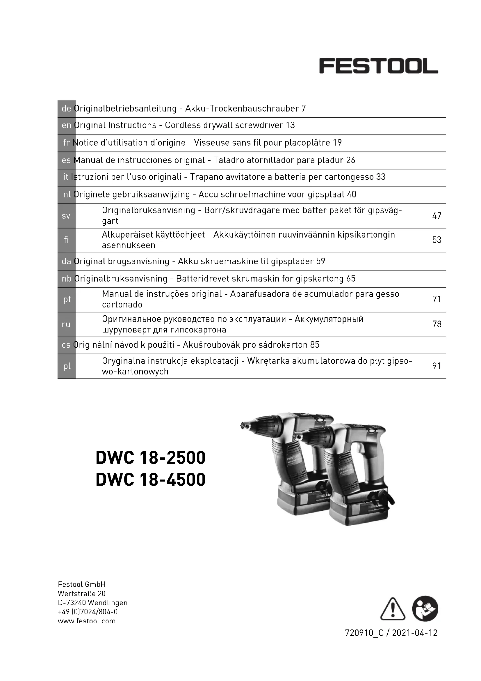 Les valeurs d'émission indiquées (vibrations, bruit) – sont fournies à des fins de comparaison avec d'autres appareils, – permettent également une estimation pro visoire des nuisances sonores et vibratoi res lors de l'utilisation, – sont représentatives des principales appli cations de l'outil électroportatif. ATTENTION Les valeurs d'émissions peuvent diverger des valeurs indiquées. Ceci dépend de l'utili sation de l'outil et du type de pièce à travail ler. ► Il est nécessaire d'évaluer les nuisances sonores réelles sur toute la durée du cycle d'utilisation. ► Déterminer ensuite des mesures de sécu rité adaptées aux nuisances sonores réel les afin de protéger l'utilisateur. 3 Utilisation conforme La visseuse pour plaquistes convient aux opé rations de vissage suivantes : DWC 18-2500 – Plaques de staff sur des structures en mé tal et en bois avec des vis à fixation rapide à nervures fraisées – Panneaux d'aggloméré/OSB sur des struc tures en bois avec des vis pour bois et pour panneaux d'aggloméré d'un diamètre max. de 5 mm DWC 18-4500 – Plaques de plâtre sur des rails métalliques profilés ( ≤ 0,88 mm) avec des vis à fixation rapide à filet fin – Plaques de plâtre sur des rails métalliques profilés (≤ 2,25 mm) avec des vis à fixation rapide à pointe de perçage – Plaques de plâtre sur des structures en bois avec des vis à fixation rapide à gros fi let L'outil électroportatif convient pour l'utilisation avec les batteries Festool de la série BP de ca tégorie de tension identique. Français 20L'utilisateur est responsable des dom mages et accidents dus à une utilisation non conforme, y compris des dommages et de l'usure résultant d'une utilisation industrielle continue. 4 Caractéristiques techniques Visseuse sans fil pour plaquistes DWC 18-2500 DWC 18-4500 Tension du moteur 18 V 18 V Vitesse de rotation à vide*