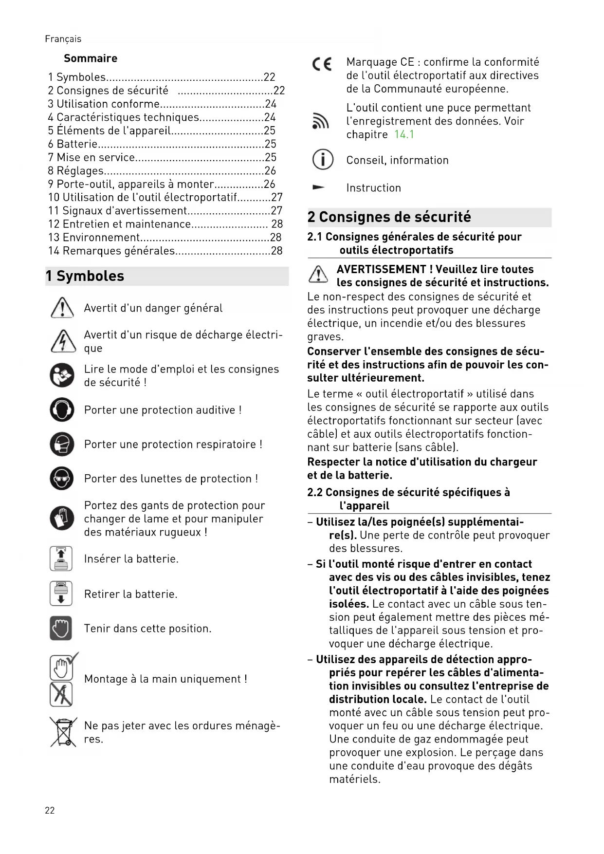 1 Symboles. 22 2 Consignes de sécurité 22 3 Utilisation conforme. 24 4 Caractéristiques techniques. 24 5 Éléments de l'appareil. 25 6 Batterie. 25 7 Mise en service. 25 8 Réglages 26 9 Porte-outil, appareils à monter. 26 10 Utilisation de l'outil electroportatif. 27 11 Signaux d'avertissement 27 12 Entretien et maintenance. 28 13 Environnement. 28 14 Remarques générales. 28