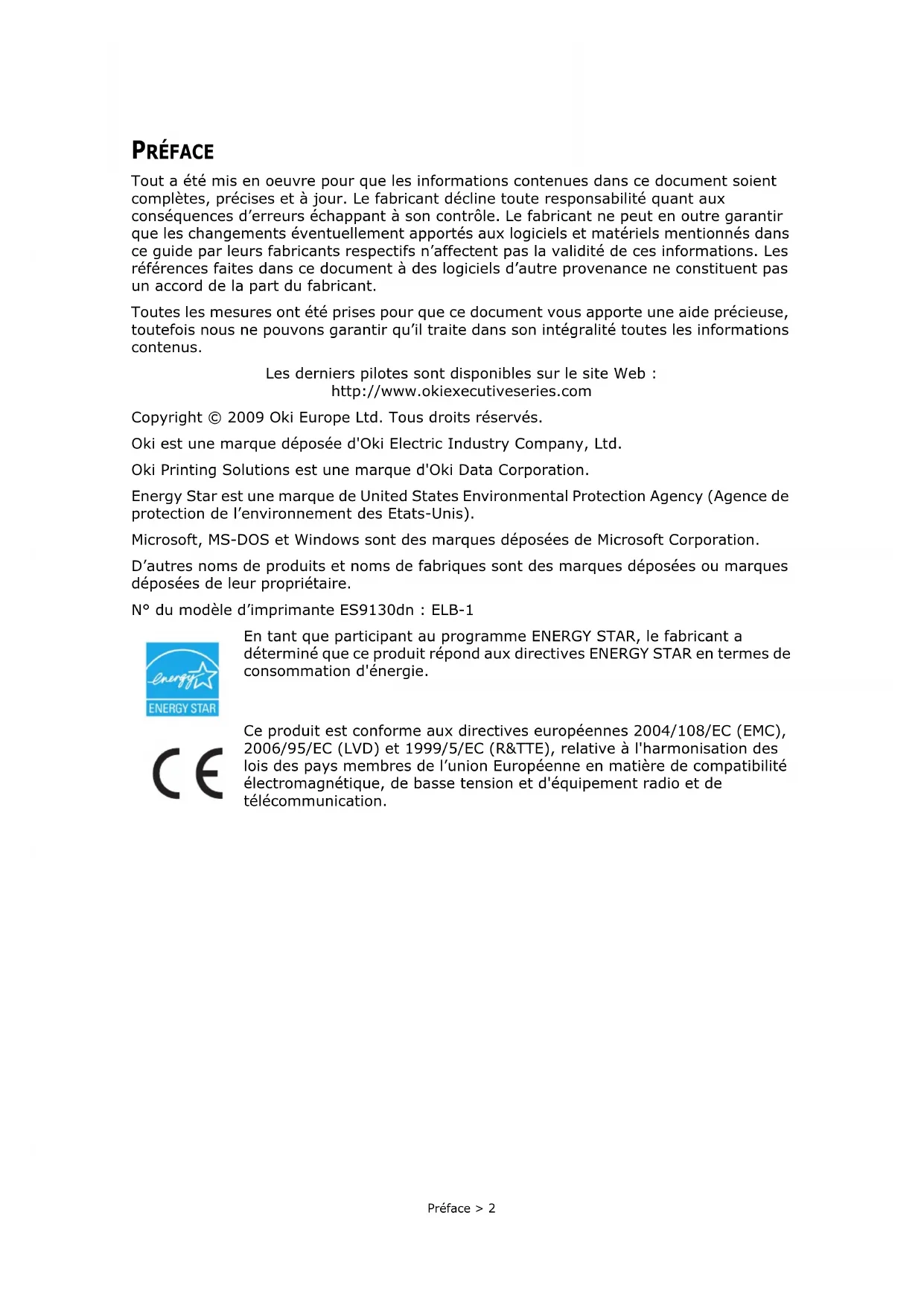 RÉFACE Tout a été mis en oeuvre pour que les informations contenues dans ce document soient complètes, précises et à jour. Le fabricant décline toute responsabilité quant aux conséquences d’erreurs échappant à son contrôle. Le fabricant ne peut en outre garantir que les changements éventuellement apportés aux logiciels et matériels mentionnés dans ce guide par leurs fabricants respectifs n’affectent pas la validité de ces informations. Les références faites dans ce document à des logiciels d’autre provenance ne constituent pas un accord de la part du fabricant. Toutes les mesures ont été prises pour que ce document vous apporte une aide précieuse, toutefois nous ne pouvons garantir qu’il traite dans son intégralité toutes les informations contenus. Les derniers pilotes sont disponibles sur le site Web : http://www.okiexecutiveseries.com Copyright © 2009 Oki Europe Ltd. Tous droits réservés. Oki est une marque déposée d'Oki Electric Industry Company, Ltd. Oki Printing Solutions est une marque d'Oki Data Corporation. Energy Star est une marque de United States Environmental Protection Agency (Agence de protection de l’environnement des Etats-Unis). Microsoft, MS-DOS et Windows sont des marques déposées de Microsoft Corporation. D’autres noms de produits et noms de fabriques sont des marques déposées ou marques déposées de leur propriétaire. N° du modèle d’imprimante ES9130dn : ELB-1 En tant que participant au programme ENERGY STAR, le fabricant a déterminé que ce produit répond aux directives ENERGY STAR en termes de consommation d'énergie. Ce produit est conforme aux directives européennes 2004/108/EC (EMC), 2006/95/EC (LVD) et 1999/5/EC (R&TTE), relative à l'harmonisation des lois des pays membres de l’union Européenne en matière de compatibilité électromagnétique, de basse tension et d'équipement radio et de télécommunication.Premiers soins d'urgence > 3