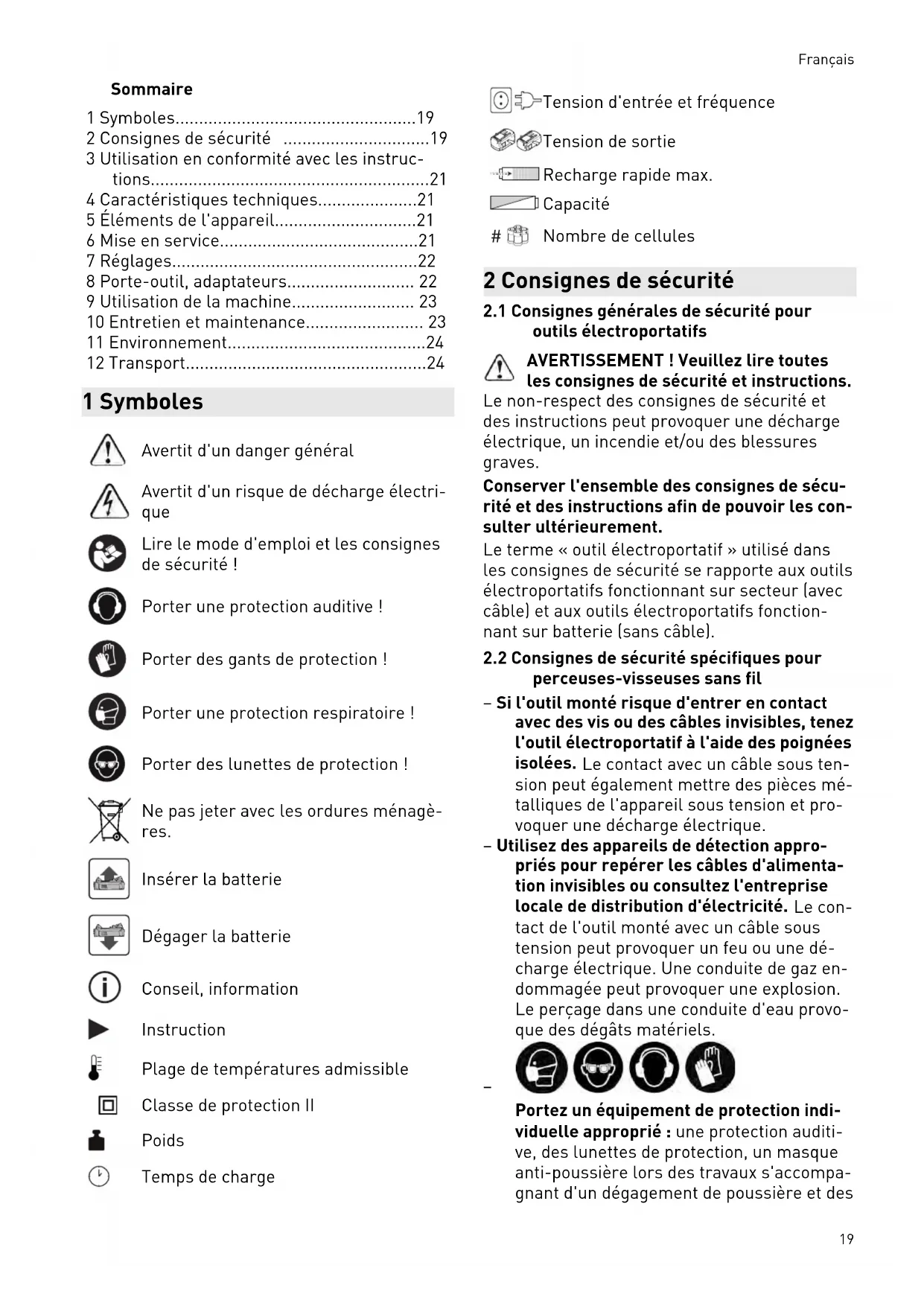 - 12 Transport 1 Symboles Avertit d'un danger général Avertit d'un risque de décharge électri que Lire le mode d'emploi et les consignes de sécurité ! Porter une protection auditive ! Porter des gants de protection ! Porter une protection respiratoire ! Porter des lunettes de protection ! Ne pas jeter avec les ordures ménagè res. Insérer la batterie Dégager la batterie Conseil, information Instruction Plage de températures admissible Classe de protection II Poids Temps de charge Tension d'entrée et fréquence Tension de sortie Recharge rapide max. Capacité p. 24