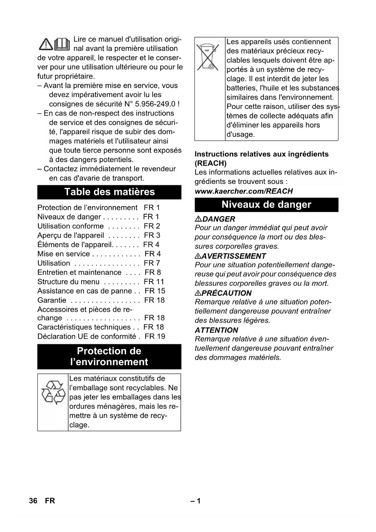 Chairman of the Board of Management Director Regulatory Affairs & Certification 35EN– 1 Lire ce manuel d'utilisation origi- nal avant la première utilisation de votre appareil, le respecter et le conser- ver pour une utilisation ultérieure ou pour le futur propriétaire. – Avant la première mise en service, vous devez impérativement avoir lu les consignes de sécurité N° 5.956-249.0 ! – En cas de non-respect des instructions de service et des consignes de sécuri- té, l'appareil risque de subir des dom- mages matériels et l'utilisateur ainsi que toute tierce personne sont exposés à des dangers potentiels. – Contactez immédiatement le revendeur en cas d'avarie de transport. Instructions relatives aux ingrédients (REACH) Les informations actuelles relatives aux in- grédients se trouvent sous : www.kaercher.com/REACH DANGER Pour un danger immédiat qui peut avoir pour conséquence la mort ou des bles- sures corporelles graves. 몇 AVERTISSEMENT Pour une situation potentiellement dange- reuse qui peut avoir pour conséquence des blessures corporelles graves ou la mort. 몇 PRÉCAUTION Remarque relative à une situation poten- tiellement dangereuse pouvant entraîner des blessures légères. ATTENTION Remarque relative à une situation éven- tuellement dangereuse pouvant entraîner des dommages matériels. Table des matières Protection de l’environnement FR 1 Niveaux de danger ... FR 1 Utilisation conforme ... FR 2 Aperçu de l'appareil ... FR 3 Éléments de l'appareil... FR 4 Mise en service ... FR 4 Utilisation ... FR 7 Entretien et maintenance ... FR 8 Structure du menu ... FR 11 Assistance en cas de panne ... FR 15 Garantie ... FR 18 Accessoires et pièces de re- change ... FR 18 Caractéristiques techniques ... FR 18 Déclaration UE de conformité . FR 19 Protection de l’environnement Les matériaux constitutifs de l’emballage sont recyclables. Ne pas jeter les emballages dans les ordures ménagères, mais les re- mettre à un système de recy- clage. Les appareils usés contiennent des matériaux précieux recy- clables lesquels doivent être ap- portés à un système de recy- clage. Il est interdit de jeter les batteries, l'huile et les substances similaires dans l'environnement. Pour cette raison, utiliser des sys- tèmes de collecte adéquats afin d'éliminer les appareils hors d'usage. Niveaux de danger 36 FR– 2 Remarque : Kärcher ne peut endosser au- cune responsabilité pour les dommages de l'appareil, les dommages des véhicules clients à nettoyer ainsi que pour tous les dommages qui ont pour origine un non res- pect des dispositions de ces instructions de service. – L'appariel est destiné à l'aspiration des impuretés sèches dans l'habitacle de véhicules motorisés. – L'aspiration de matériaux combustibles, de poussières nocives à la santé et de fluides n'est pas conforme à la destina- tion et de ce faite interdite. – Cet appareil est approprié pour l'utilisa- tion industrielle. – Une variante à un emplacement (SB VC 1) ou à deux emplacements (SB VC