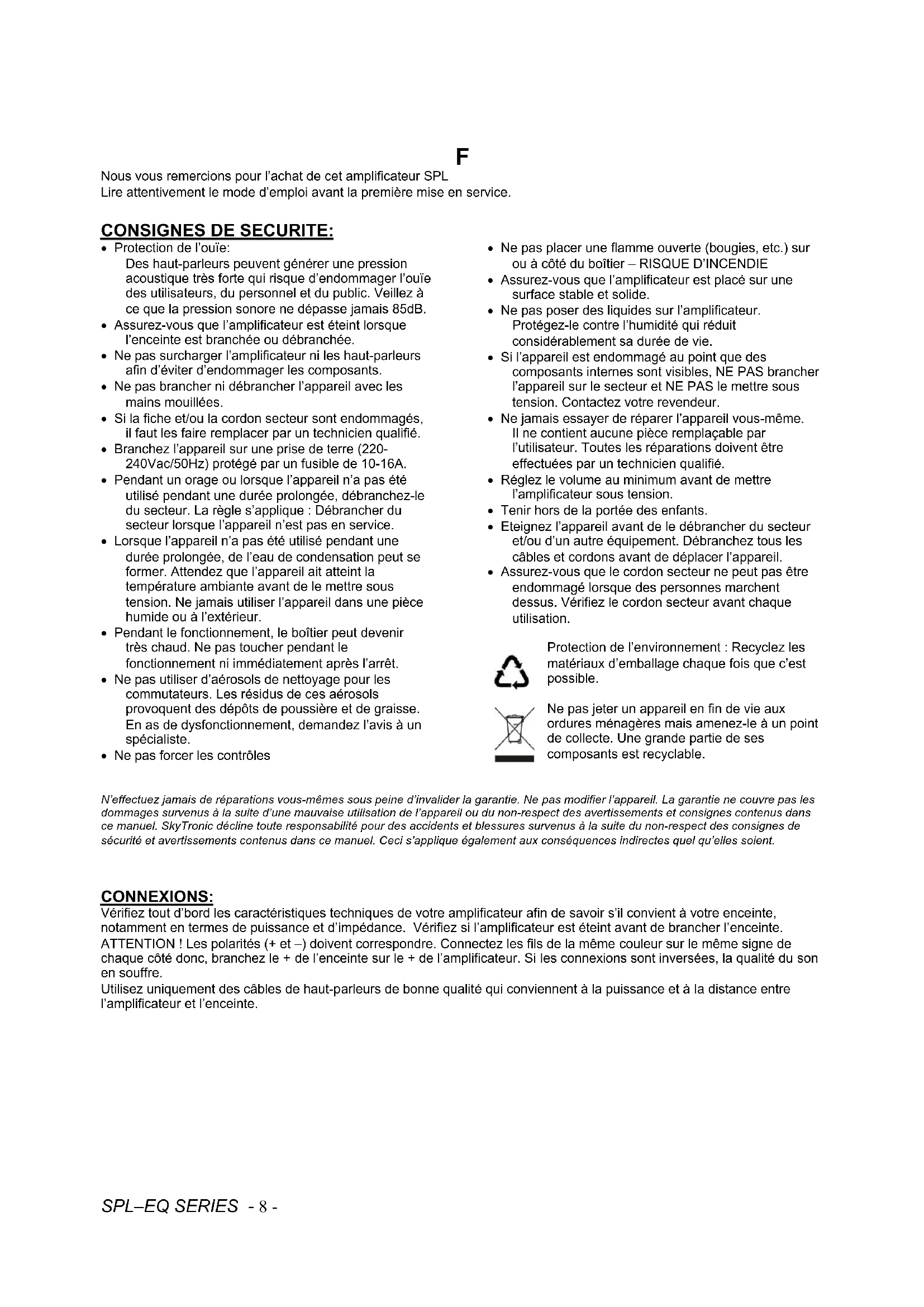 source ou les différences dans l’acoustique de la pièce. Chaque égaliseur possède sa propre amplification ou réduction pour les hautes, moyennes et basses fréquences.SPL–EQ SERIES - 10 - Pour un fonctionnement fiable et sans problème, respectez les points suivants: